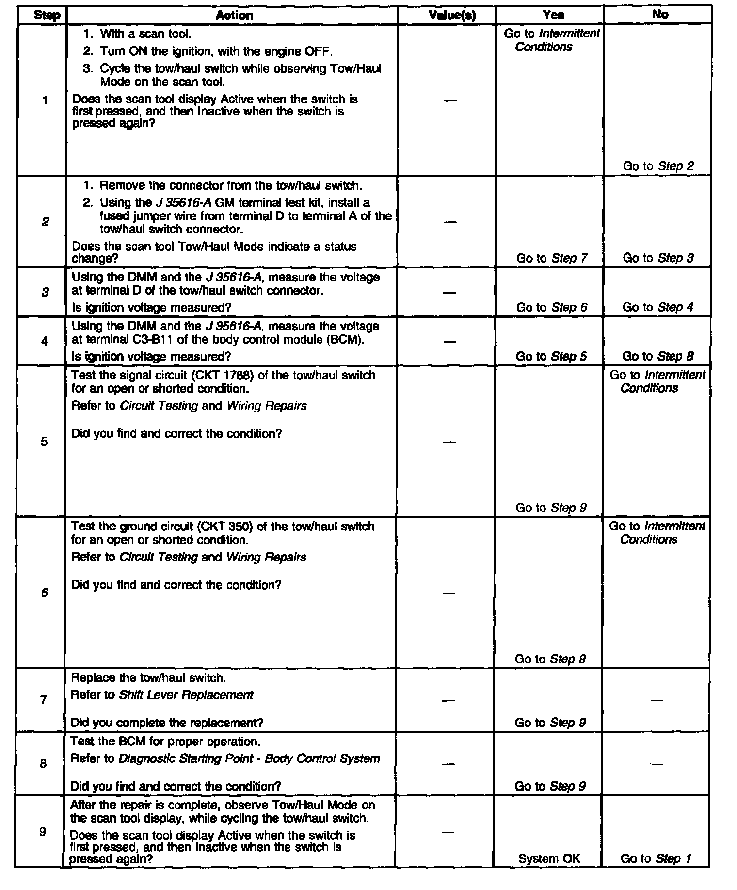 If the electrical circuit tests are OK and the tow/haul shift pattern is not occurring, there may be a mechanical/hydraulic condition that prevents tow/haul operation. Refer to Symptoms - Automatic Transmission.