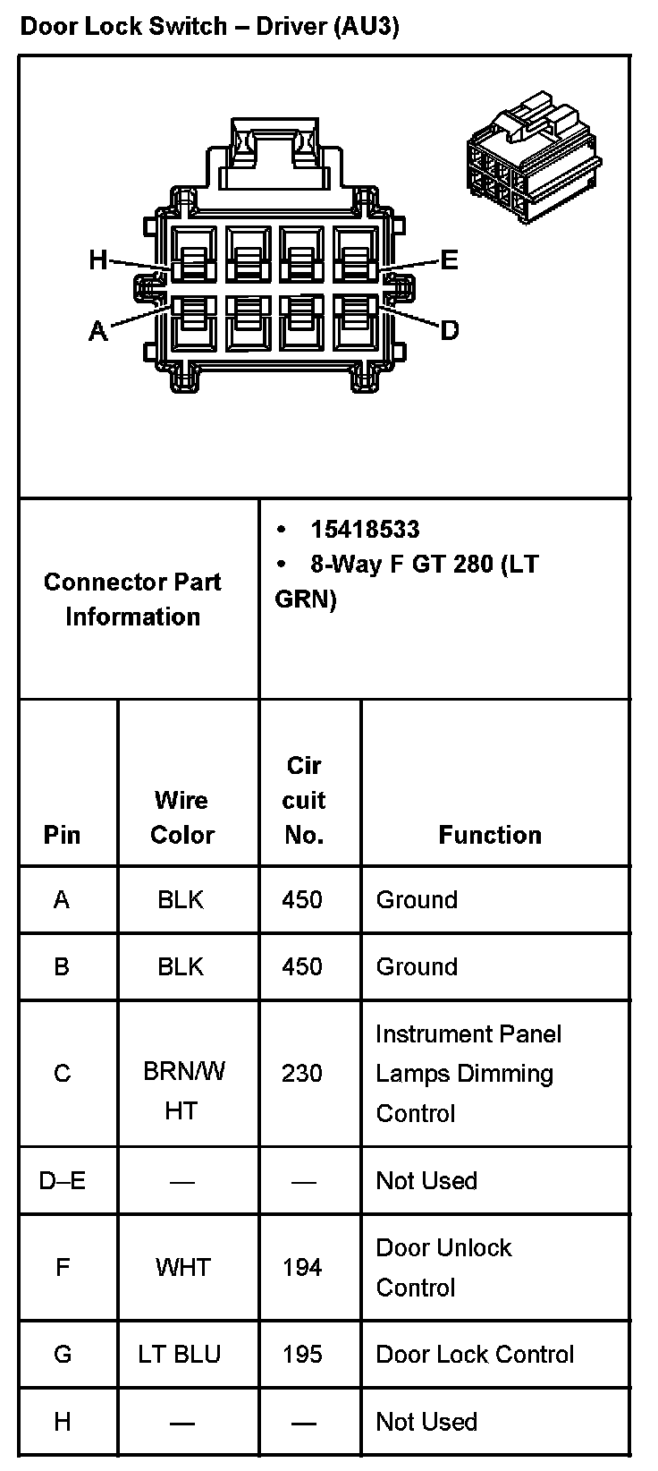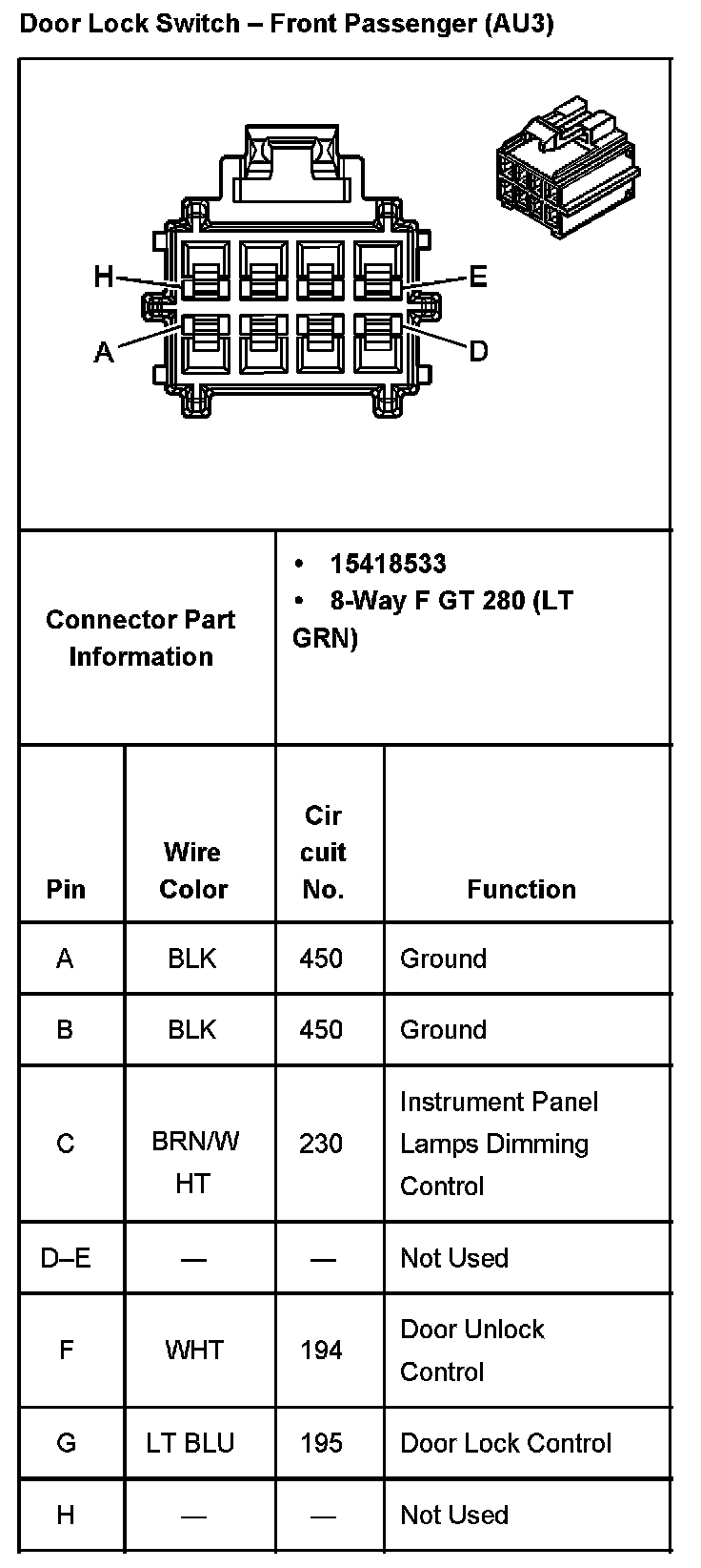 Door Lock Switch - Front Passenger With RPO Code AU3: