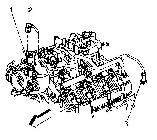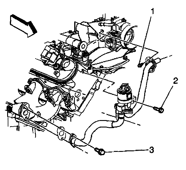 15. Remove the EVAP purge solenoid bolt (2). solenoid (3). and isolator (1) truism the intake manifold.