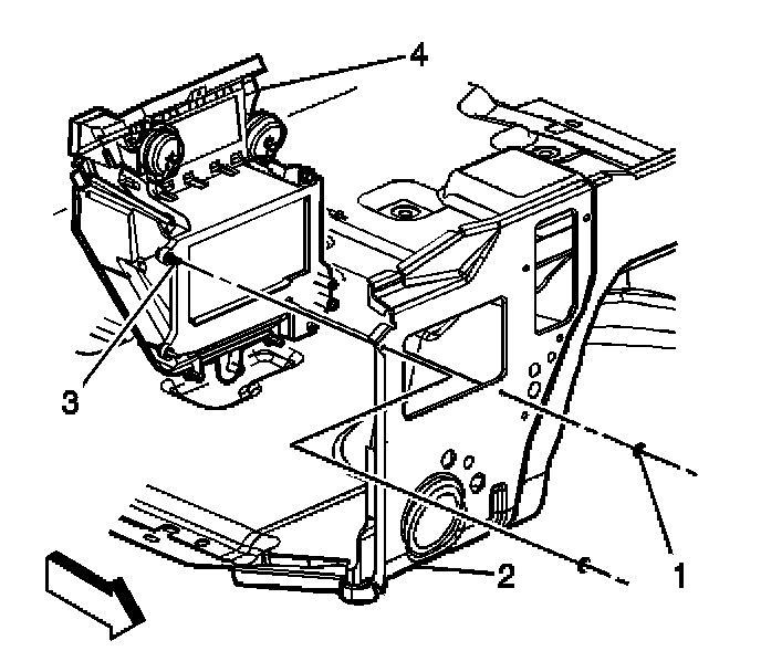 2. Remove the heater assembly retaining nuts (1) from the engine compartment.
