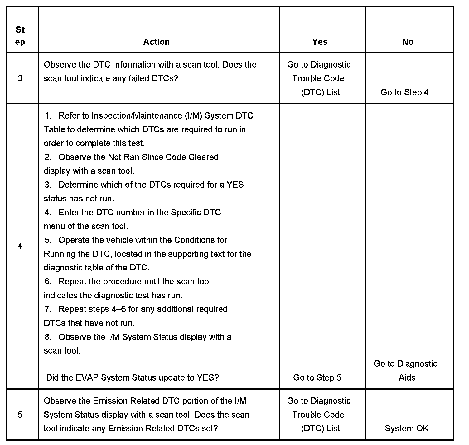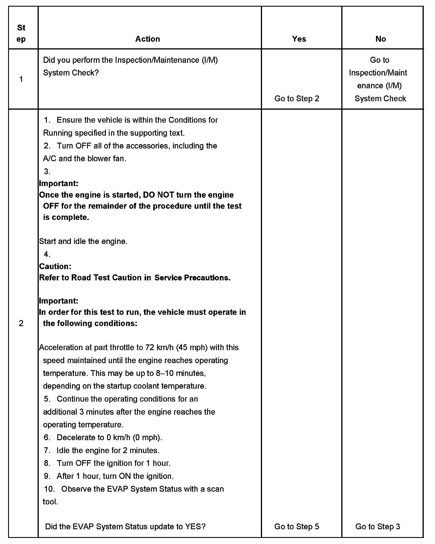 The purpose of this test is to satisfy the enable criteria necessary in order to execute the I/M readiness diagnostics for the evaporative emission (EVAP) system. The test may be used in order to set the I/M System Status indicators to YES. The I/M System Status Display on the scan tool provides an indication of when the control module has completed the required tests. The I/M System Status does not indicate that the tests have passed or failed. When all of the diagnostics for a specific system have run and passed and I/M System Status will update to YES. If a test for a specific system has failed, the I/M System Status will update to YES, indicating a determination was made, even if all of the other tests for that system have not run. Performing a visual inspection prior to running the EVAP test may prevent having to repeat the test. A failed or aborted test will require the vehicle to cool down in order to meet the enable criteria to run another test.