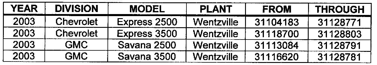 Involved are certain 2003 Chevrolet Express and GMC Savana 2500 Series vans with 8,500 lb. (C5F) or 8,600 lb. (C6P) GVW rating, and in Chevrolet Express and GMC Savana 3500 Series vans built between October 14, 2002 and October 25, 2002, and within the VIN breakpoints shown.