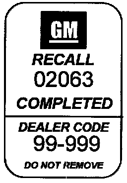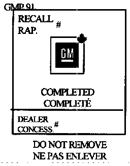 Put the Recall Identification Label on a clean and dry surface of the radiator core support in an area that will be visible to people servicing the vehicle. Additional Recall Identification Labels for Canadian dealers can be obtained from DGN by calling 1-800-668-5539 (Monday-Friday, 8:00 a.m. to 5:00 p.m. EST). Ask for Item Number GMP 91 when ordering.