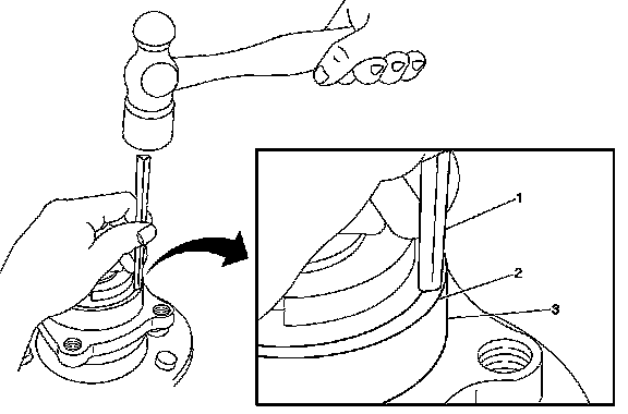 14. Carefully install a new dust cap on the hub (3) using a drift (1) and mallet around the perimeter (2).