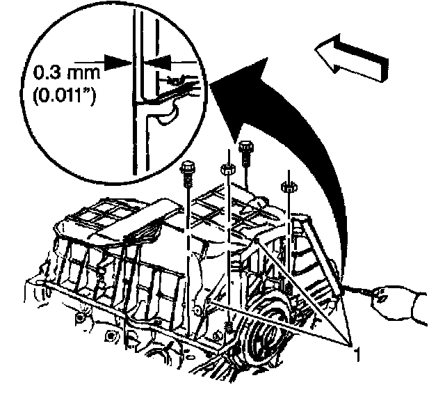 Use a feeler gage to check the clearance between the oil pan-to-transmission housing measurement points. If the clearance exceeds 0.3 mm (0.011 inch) at any of the 3 oil pan-to-transmission housing measurement points (1), then repeat the step until the oil pan-to-transmission housing clearance is within the specification. The oil pan must always be forward of the rear face of the engine block.