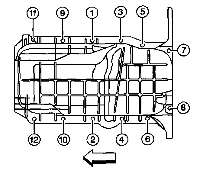 8. Tighten the oil pan bolts and nuts in sequence (1-12).