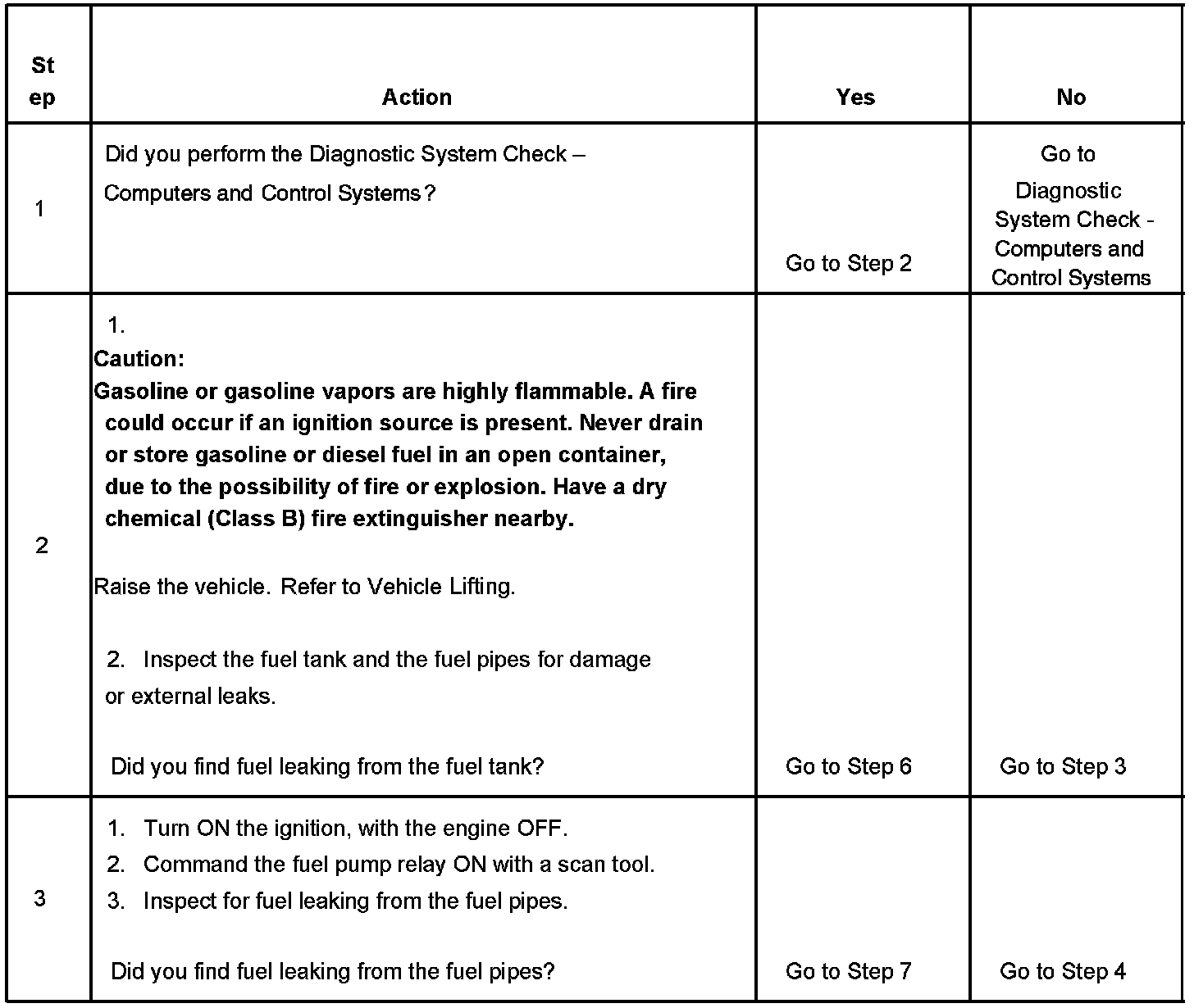 The numbers below refer to the step numbers on the diagnostic table.