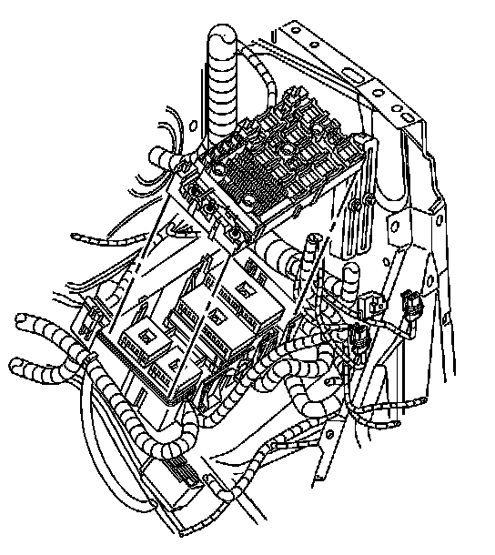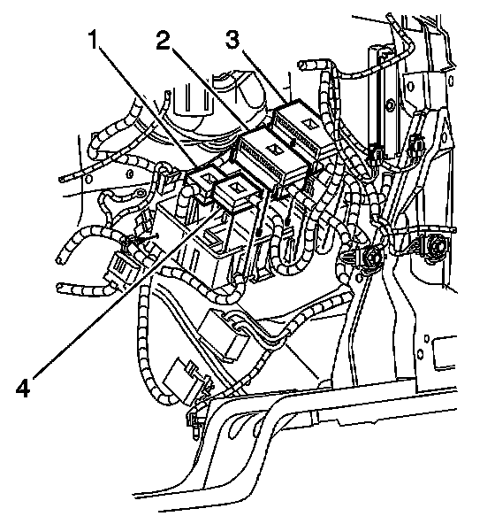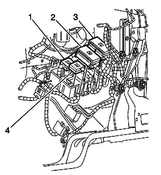 5. Remove from the junction block base the Chassis Harness (1), the I/P Harness (2), the Engine Harness (3), and the Forward LP Harness (4).