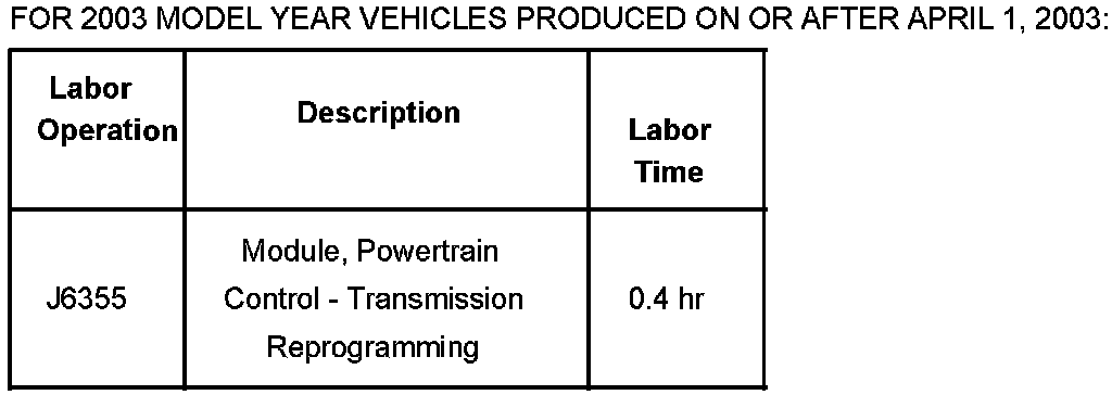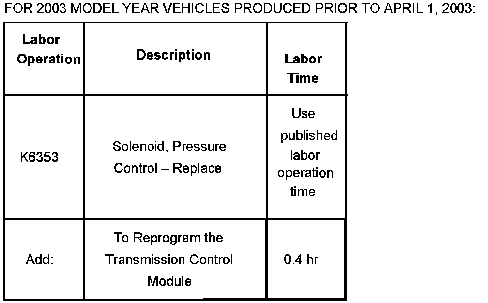For 2003 model year vehicles produced prior to April 1, 2003, replace the Pressure Control Solenoid (PCS). Refer to the Control and Shift Solenoid Replacement procedure in the Transmission sub-section of the Service Manual (SI Document ID #825149). Also, reprogram the Powertrain Control Module (PCM).