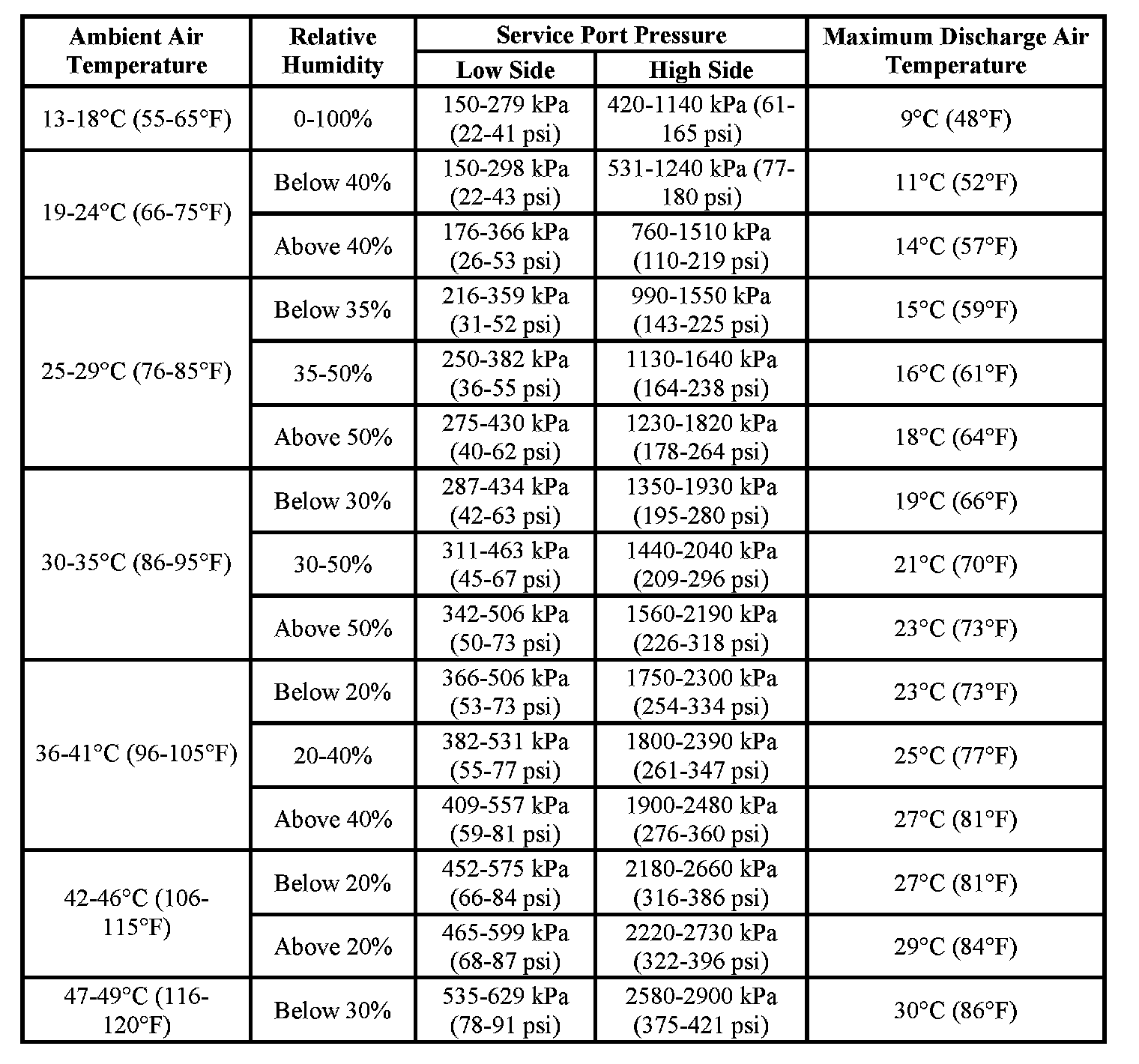 A/C Performance Table: