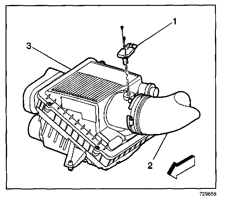 1. Disconnect the mass air flow/intake air temperature (MAF/IAT) sensor electrical connector (1).