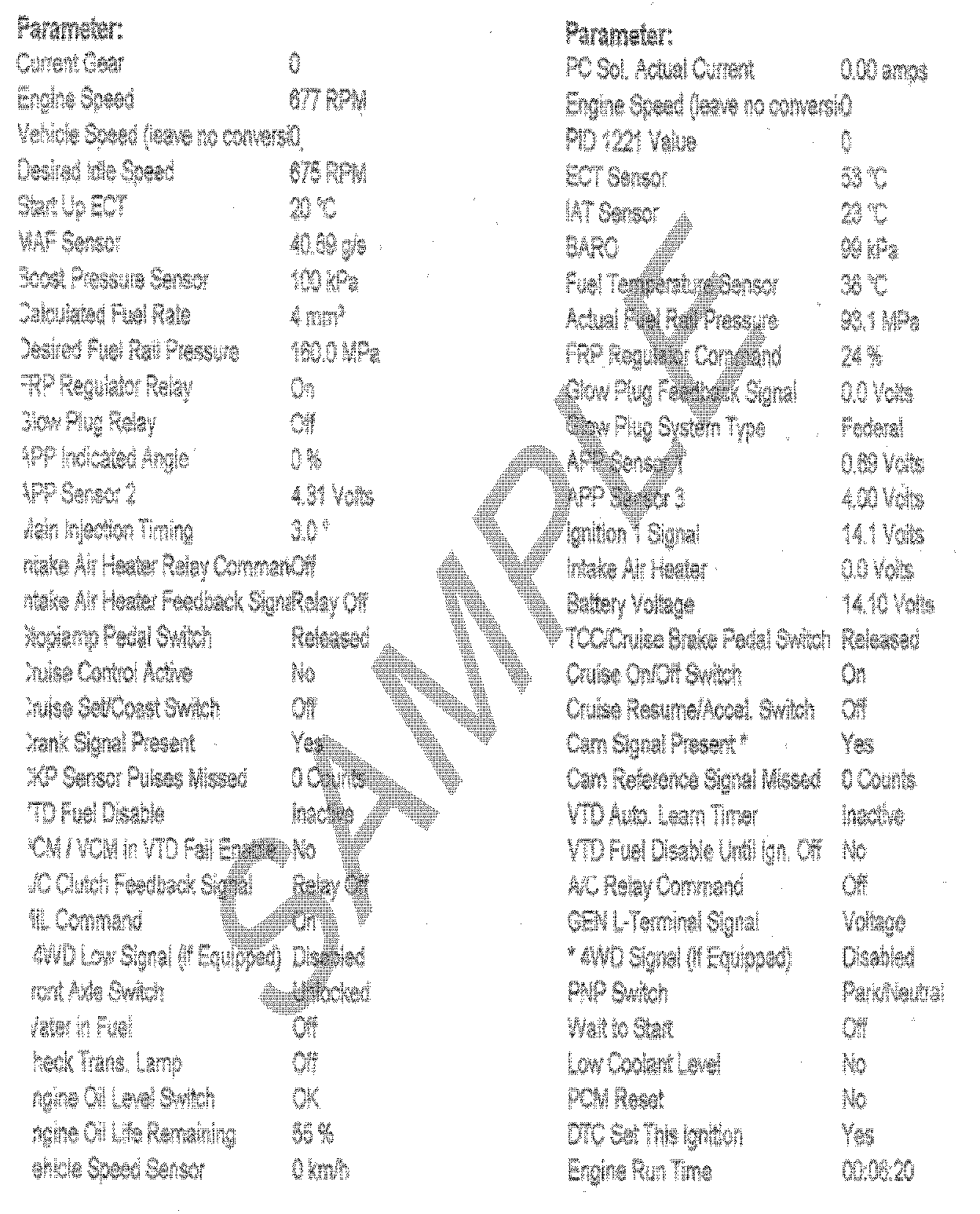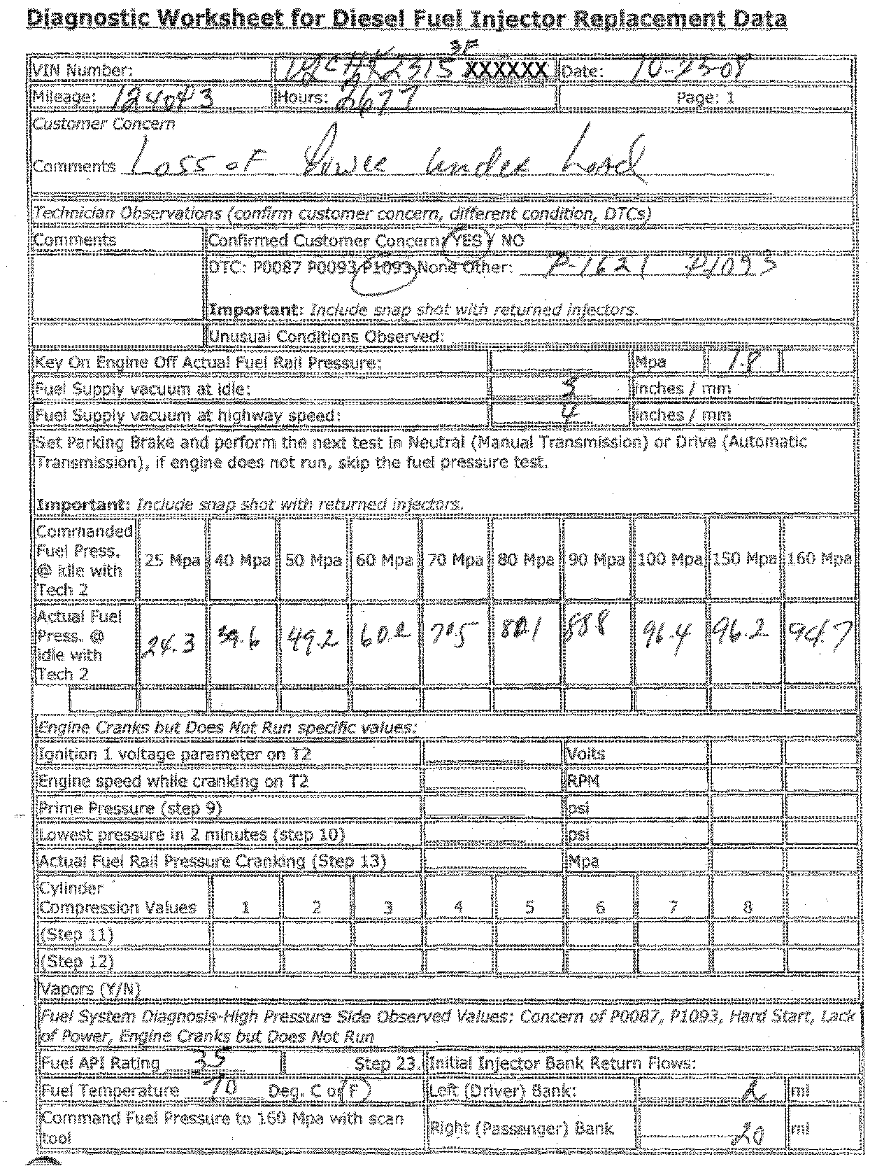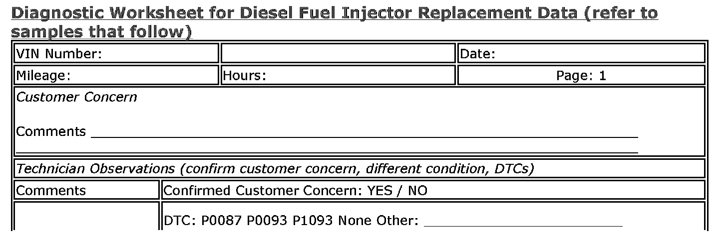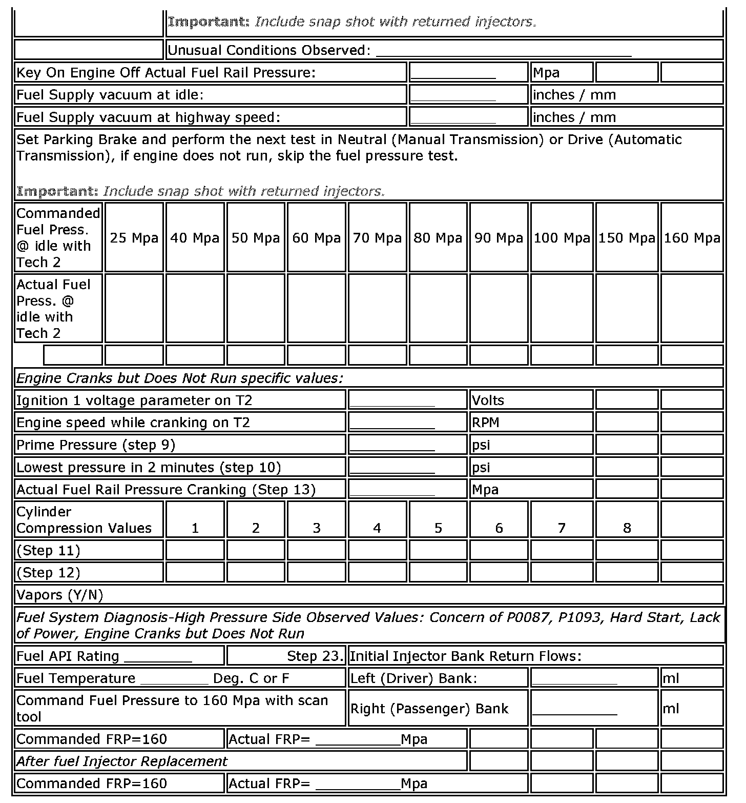 The diagnostic worksheet, snapshot of the preliminary (actual) fuel rail pressure vs. desired as commanded by the Tech 2(R) to 160 MPa, and a copy of the repair order with technician comments MUST be returned with the removed injectors.
