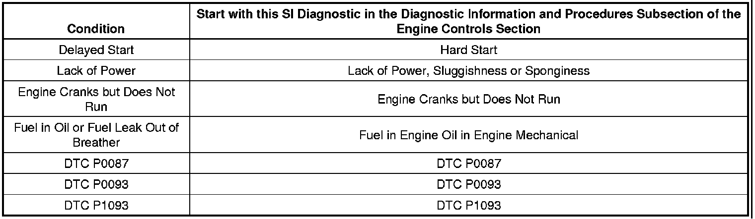 Reference the table below in order to follow current SI diagnostics for the condition that the vehicle is experiencing.