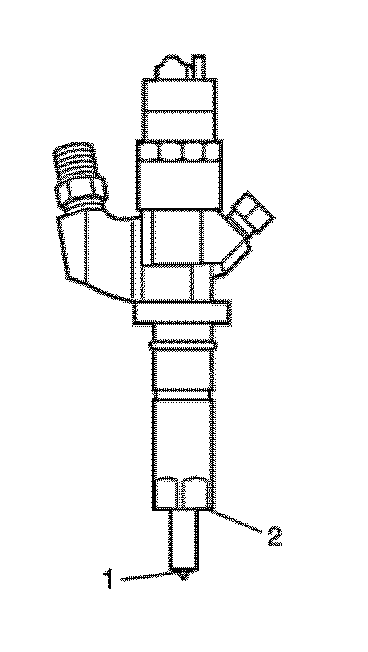 1. Use a soft bristle non-metallic brush and fuel injector cleaner, P/N 88861802 (in Canada, P/N 88861804), or equivalent, to remove any deposits from the nozzle tip (1) and the copper washer sealing area (2) before reinstallation.