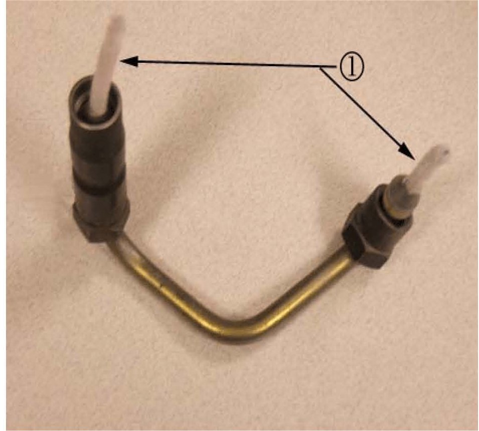 9. Use pipe cleaners (1) to block the ends of the high pressure lines so the abrasive blasting glass beads will not contaminate the inside of the pipes. Before removing the pipe cleaners, clean them by using regulated compressed air to blow any debris and/or media glass beads from the pipe cleaners.