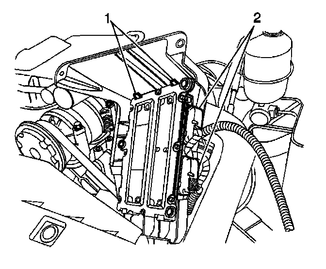 2. Remove the TCM cover bolts (1) located on the left side of the radiator shroud.