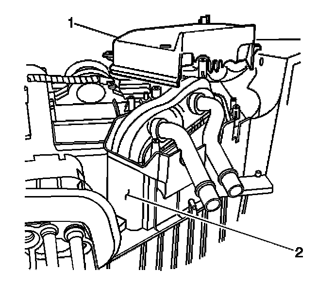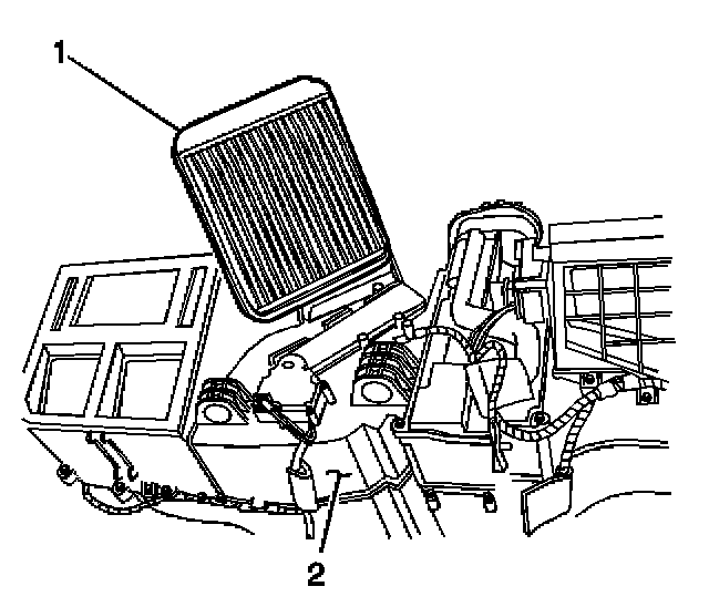 3. Remove the heater core cover (1) from the HVAC module assembly (2).