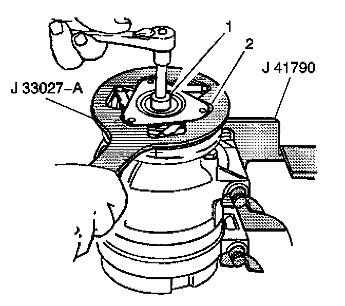 3. Hold the clutch hub and drive plate assembly (2) in place using the J 33027-A.