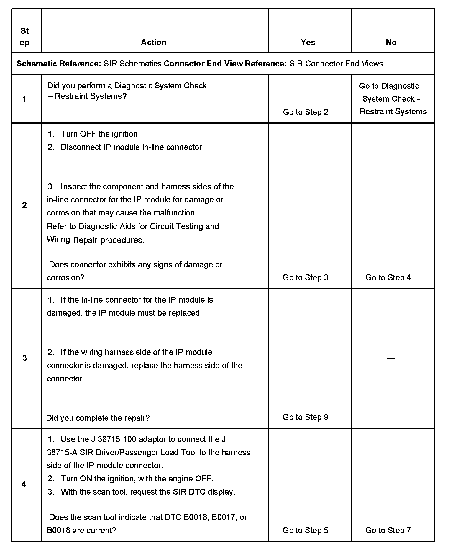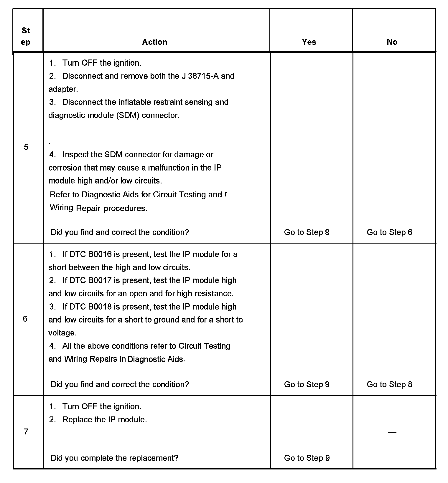 6. Tests to see what DTCs are present. If DTC B0016 is present, test the IP module for a short between high and low circuits. If DTC B0017 is present, test the IP module high and low circuits for an open and for high resistance. If DTC B0018 is present, test the IP module high and low circuits for a short to ground and for a short to voltage.