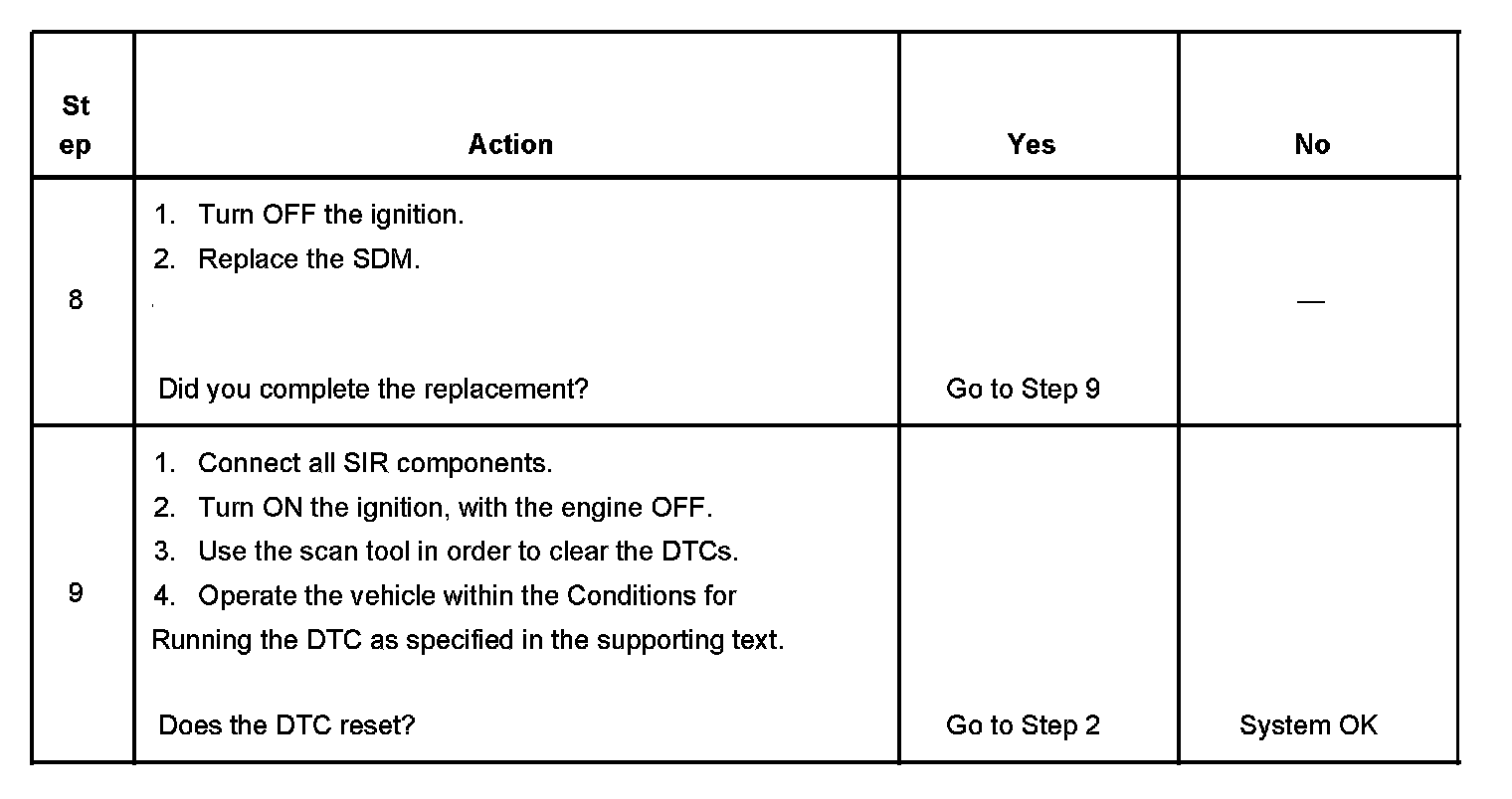 The passenger deployment loop consists of a inflatable restraint IP module, the IP module high and IP module low circuits. There is a shorting bar used within the IP module connector which will short together both IP module high and low circuits when the connector is disconnected, this will help to prevent unwanted deployment of the inflator module during servicing. During a frontal crash of sufficient force the inflatable restraint sensing and diagnostic module (SDM) will allow current to flow through the deployment loop in order to deploy the IP module. The SDM performs continuous diagnostic tests on the deployment loops to check for proper circuit continuity and for shorts to ground or voltage. If a malfunction is detected, a diagnostic trouble code (DTC) will be stored in memory.