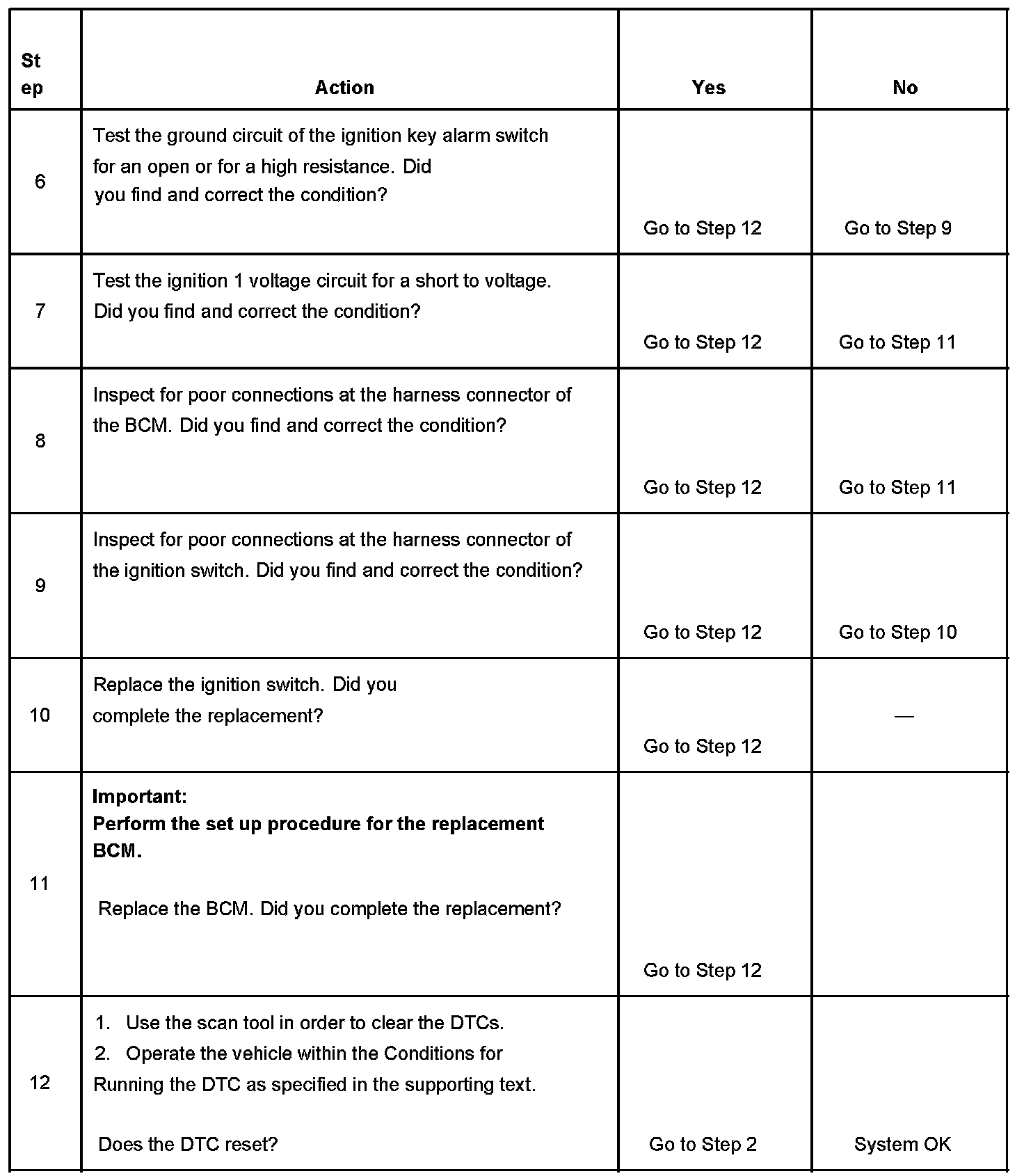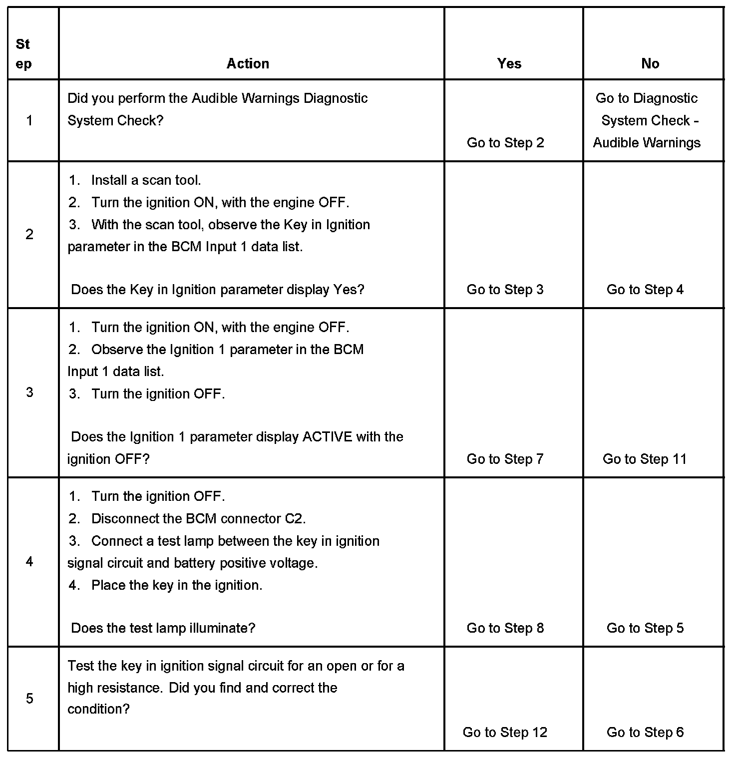 The body control module (BCM) monitors the ignition key alarm switch. When the key is in the ignition, the ignition key alarm switch is closed and the signal circuit is low. When the key is not in the ignition, the ignition key alarm switch is open and the signal circuit is high.