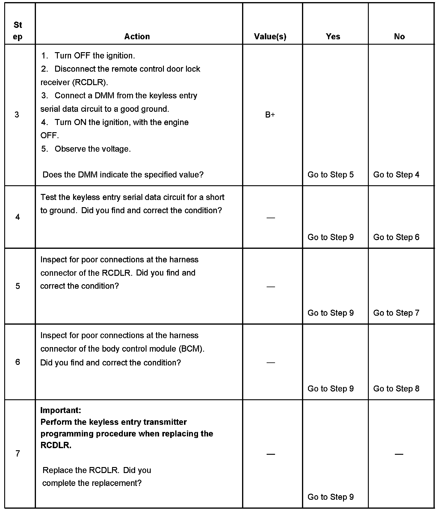 3. This step checks the keyless entry serial data circuit for voltage supplied by the body control module (BCM).
