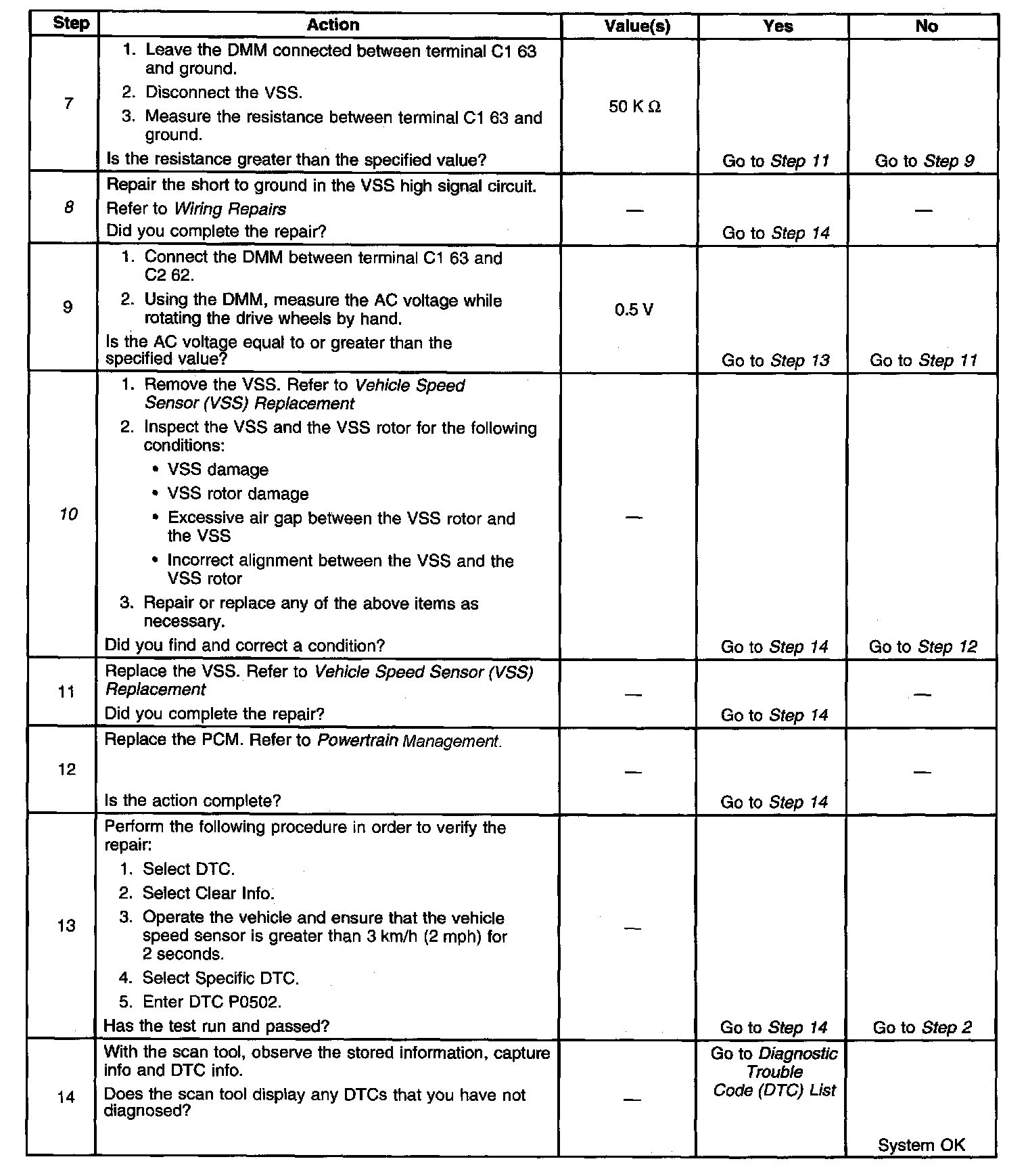5. The resistance measurement will not change if either the VSS high signal circuit or the VSS low signal circuit, but not both, is shorted to ground. The vehicle speed detector in the PCM and the VSS are matched in such a way that an open or a short to ground in the VSS low signal circuit will not usually cause a loss of speed signal or a DTC P0502 to set.