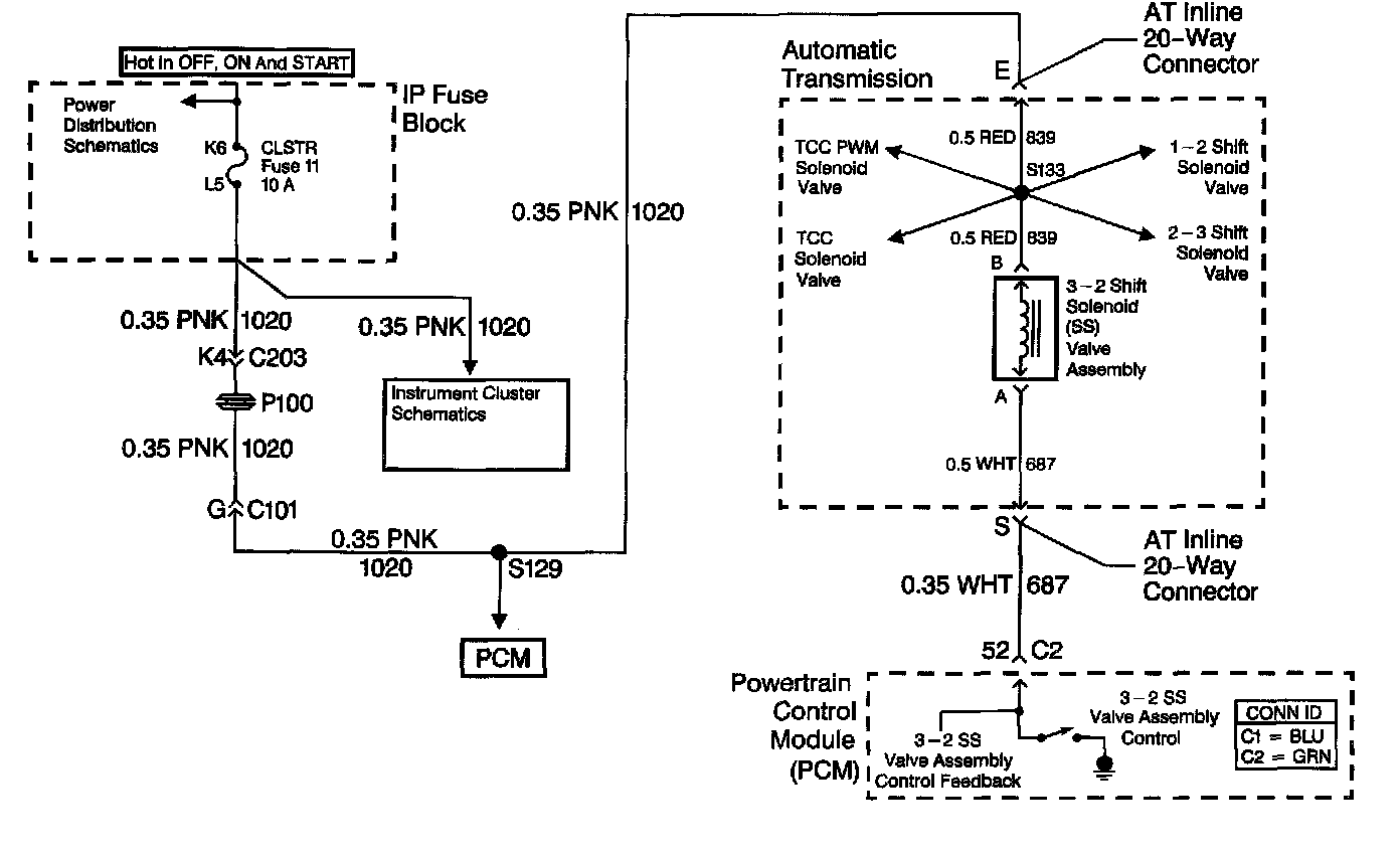 The 3-2 shift solenoid (SS) valve assembly is a normally-closed, 3-port, on/off device that controls the 3-2 downshift. The solenoid attaches to the control valve body within the transmission. The solenoid receives ignition voltage through the OFF/ON/START voltage circuit. The powertrain control module (PCM) controls the solenoid by providing a ground path on the 3-2 shift solenoid valve control circuit. During a 3-2 downshift, the 2-4 band applies as the 3-4 clutch releases. The PCM varies the timing between the 3-4 clutch release and the 2-4 band apply, depending on the vehicle speed and the throttle position.