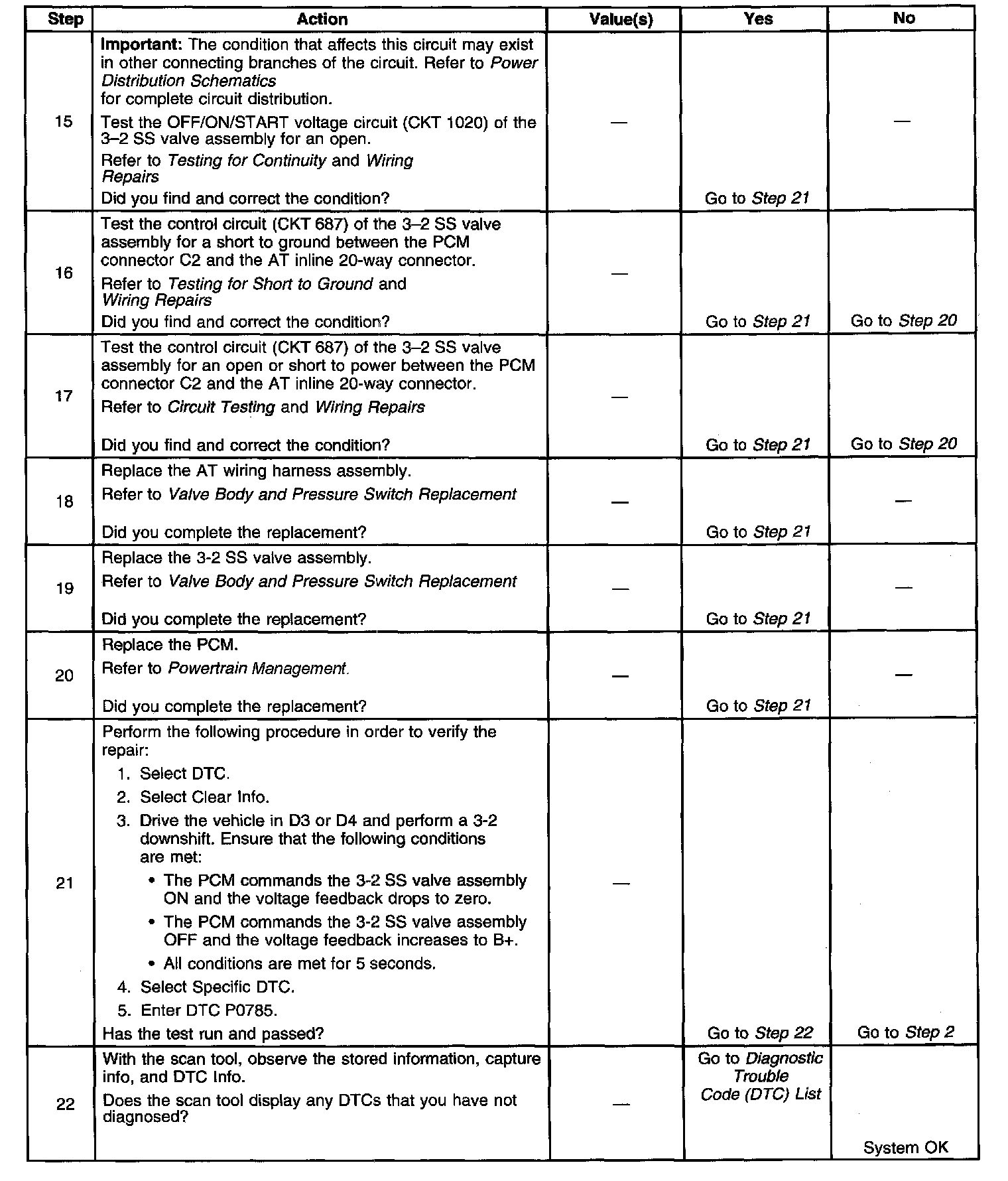 When the PCM detects a continuous open, short to ground or short to power in the 3-2 SS valve assembly circuit, then DTC P0785 sets. DTC P0785is a type A DTC.