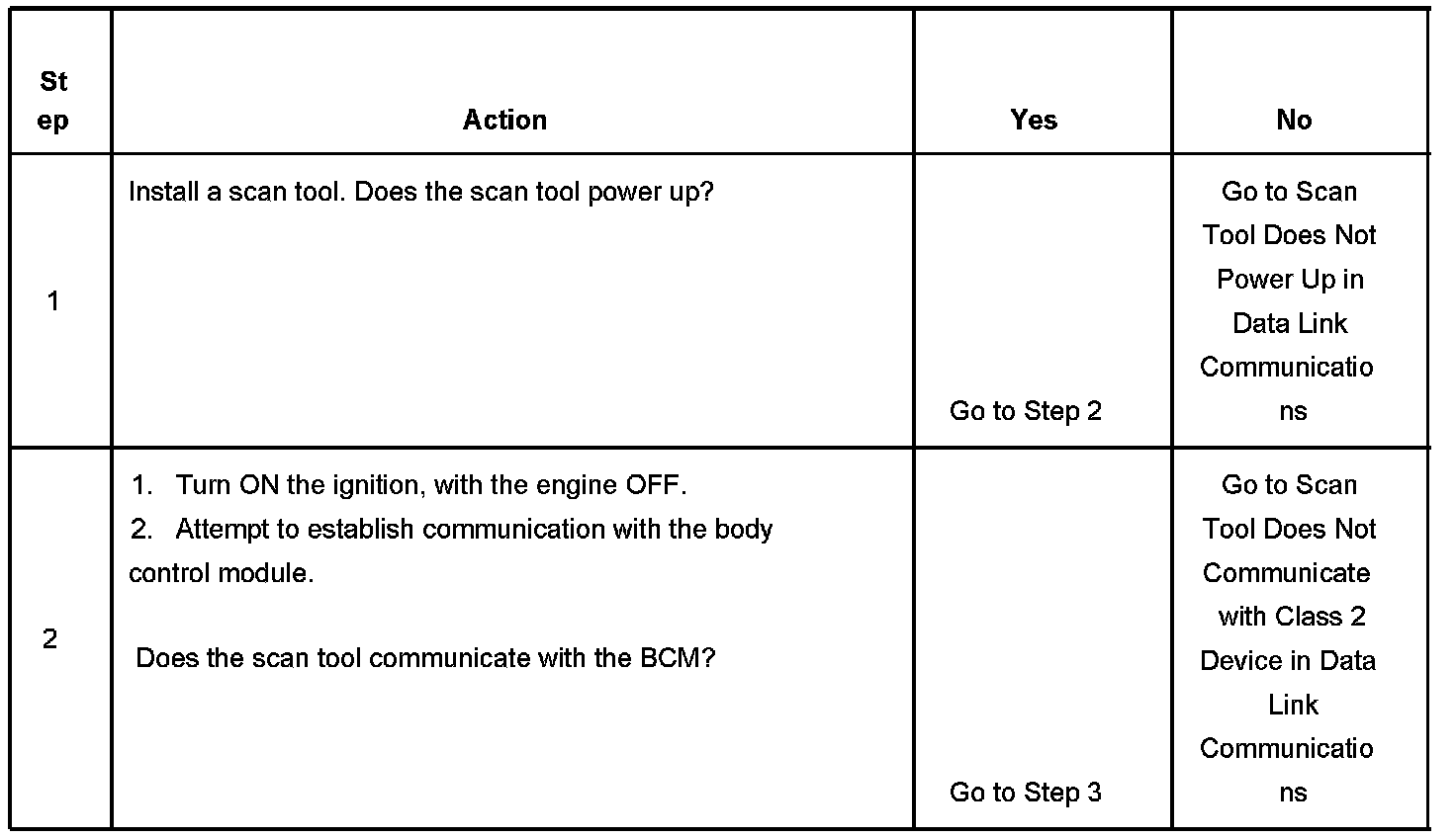 2. Lack of communication may be due to a partial malfunction of the class 2 serial data circuit or due to a total malfunction of the class 2 serial data circuit. The specified procedure will determine the particular condition.