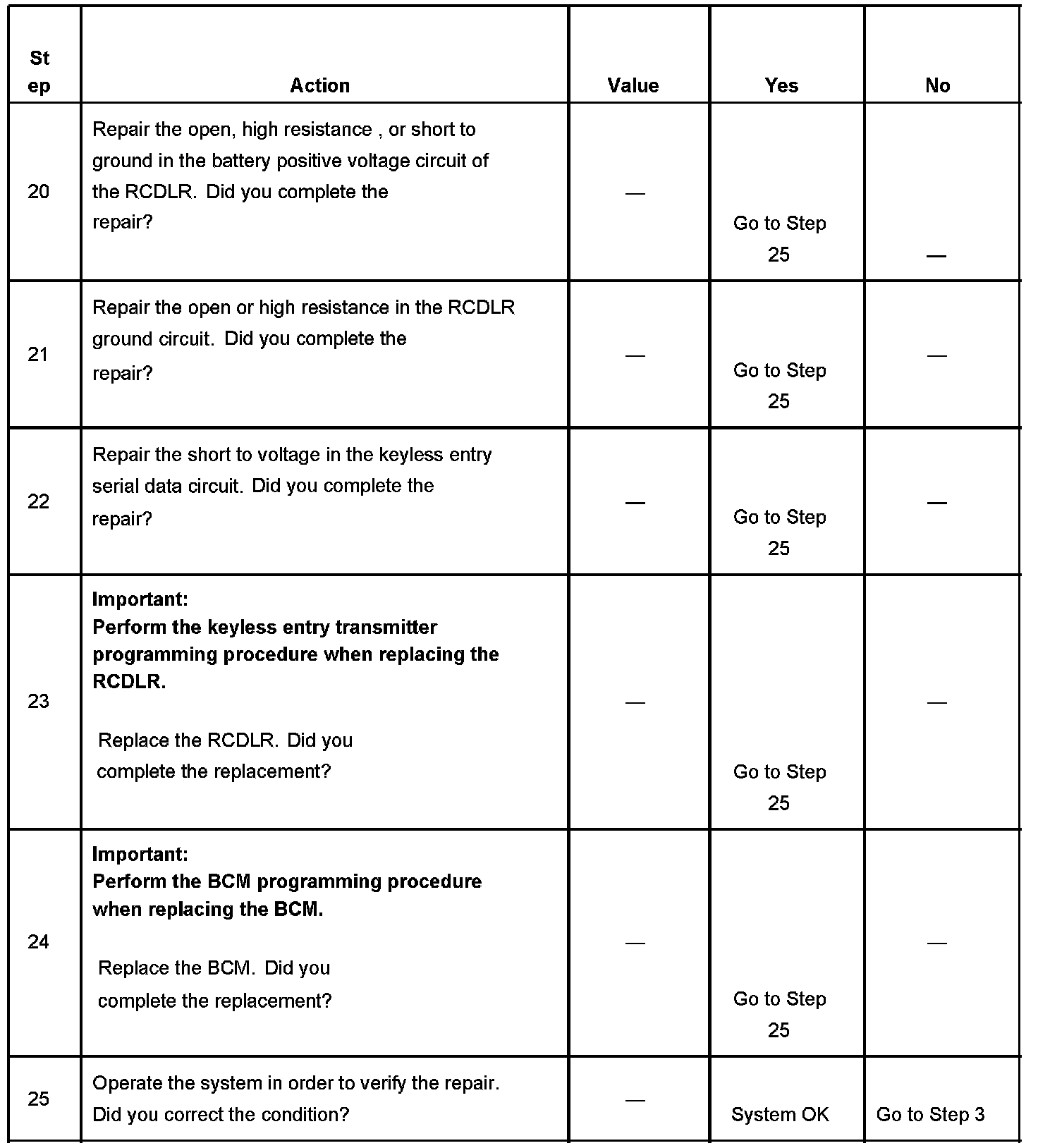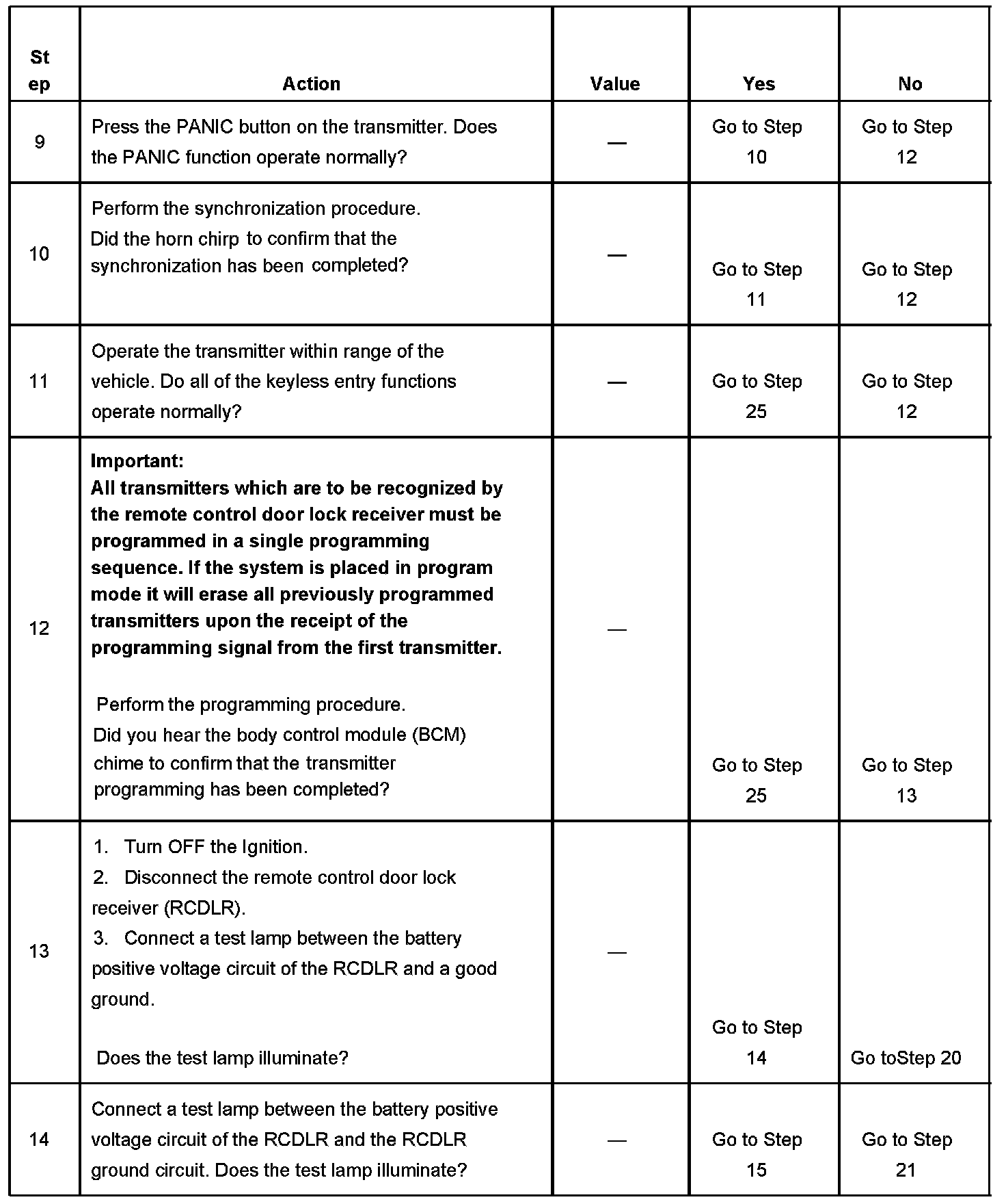 16. An illuminated test lamp at step 16 reveals a short to voltage in the serial data circuit.