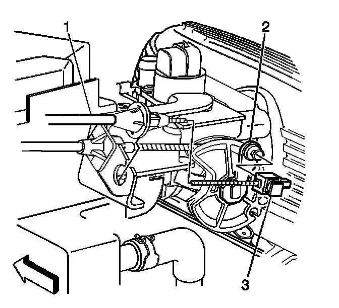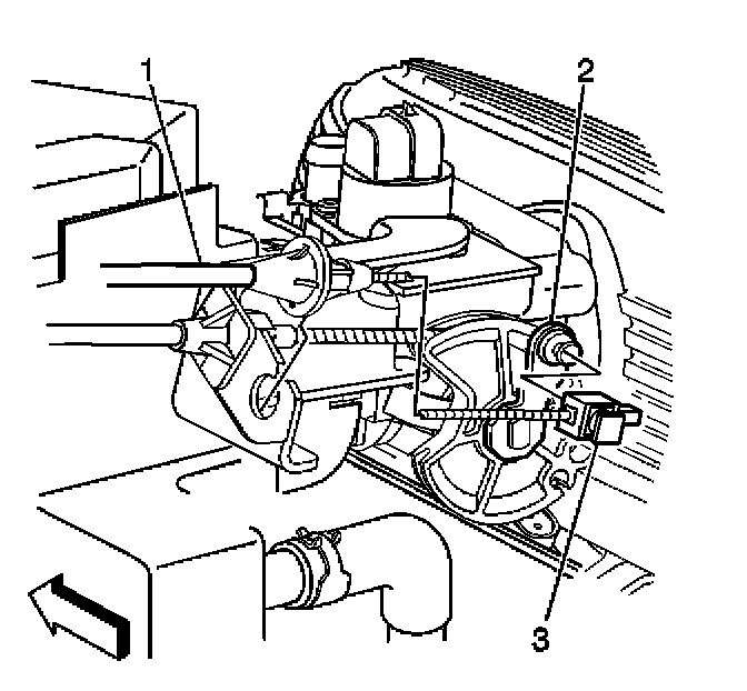 3. In order to release the tension on the cruise control adjuster, rotate the cam lever. Disconnect the cruise control cable adjuster (3) from the nail head on the throttle cam lever.