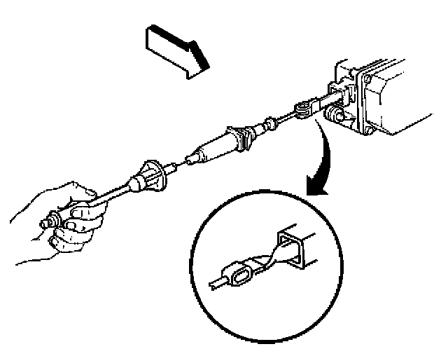 9. Pull the cable conduit toward the right side of the vehicle. Thread the cable through the slot in the round hole of the cable bracket.