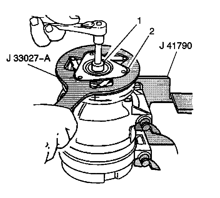 11. Hold the clutch plate and hub assembly (2) with the J 33027-A.