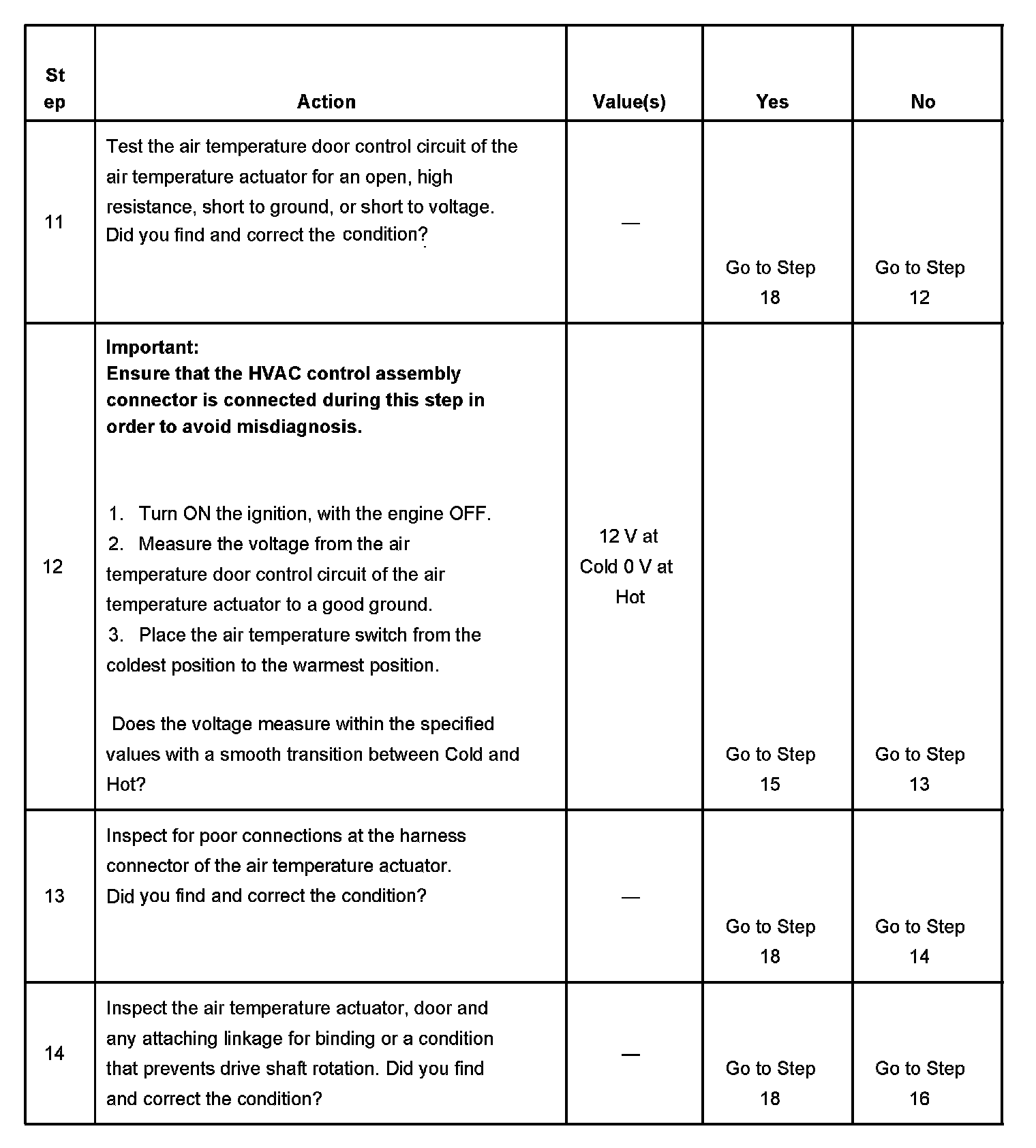 13. The voltage will vary between 0-12 volts during normal operation. The HVAC control module connector must be connected during this step.