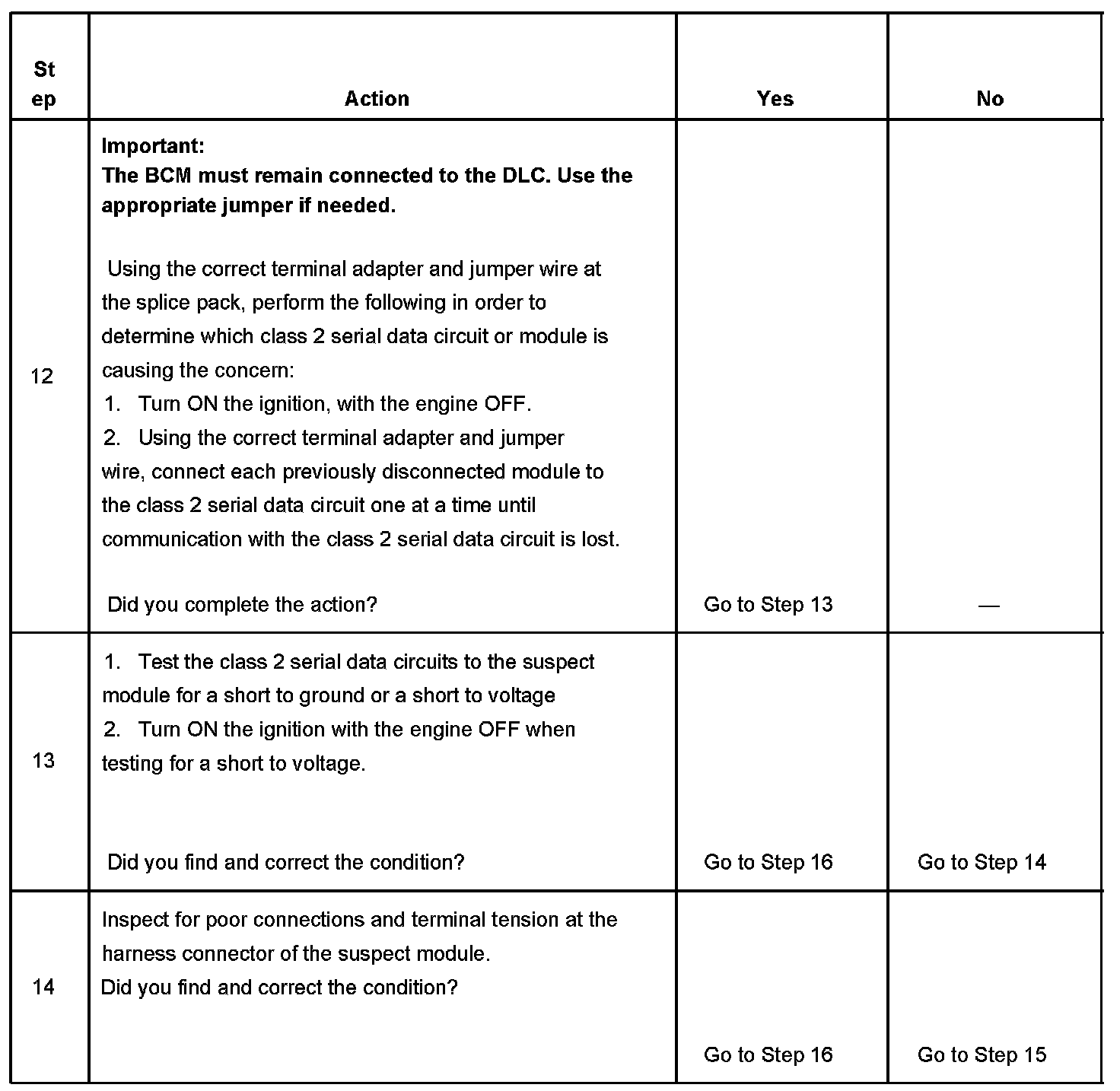 12. Normal class 2 serial data communication cannot take place until the body control module (BCM) sends the appropriate power mode message. If the BCM does not send a wake-up message, other modules on the class 2 serial data circuit may not communicate.