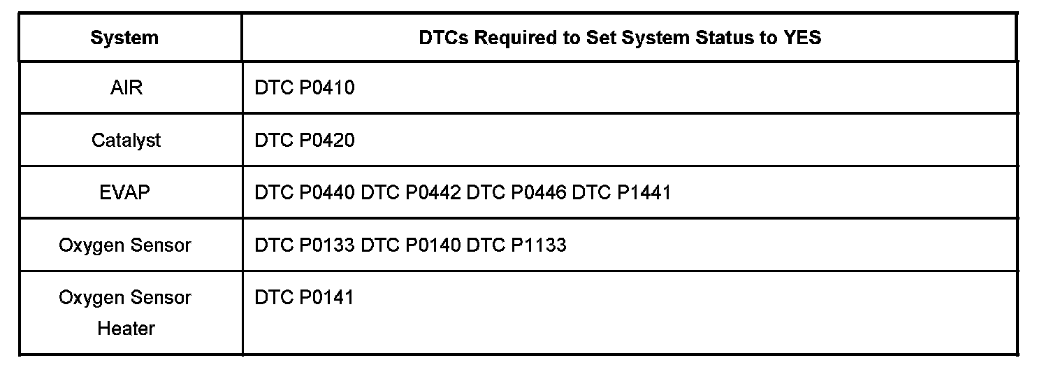 Inspection/Maintenance (I/M) System DTC Table: