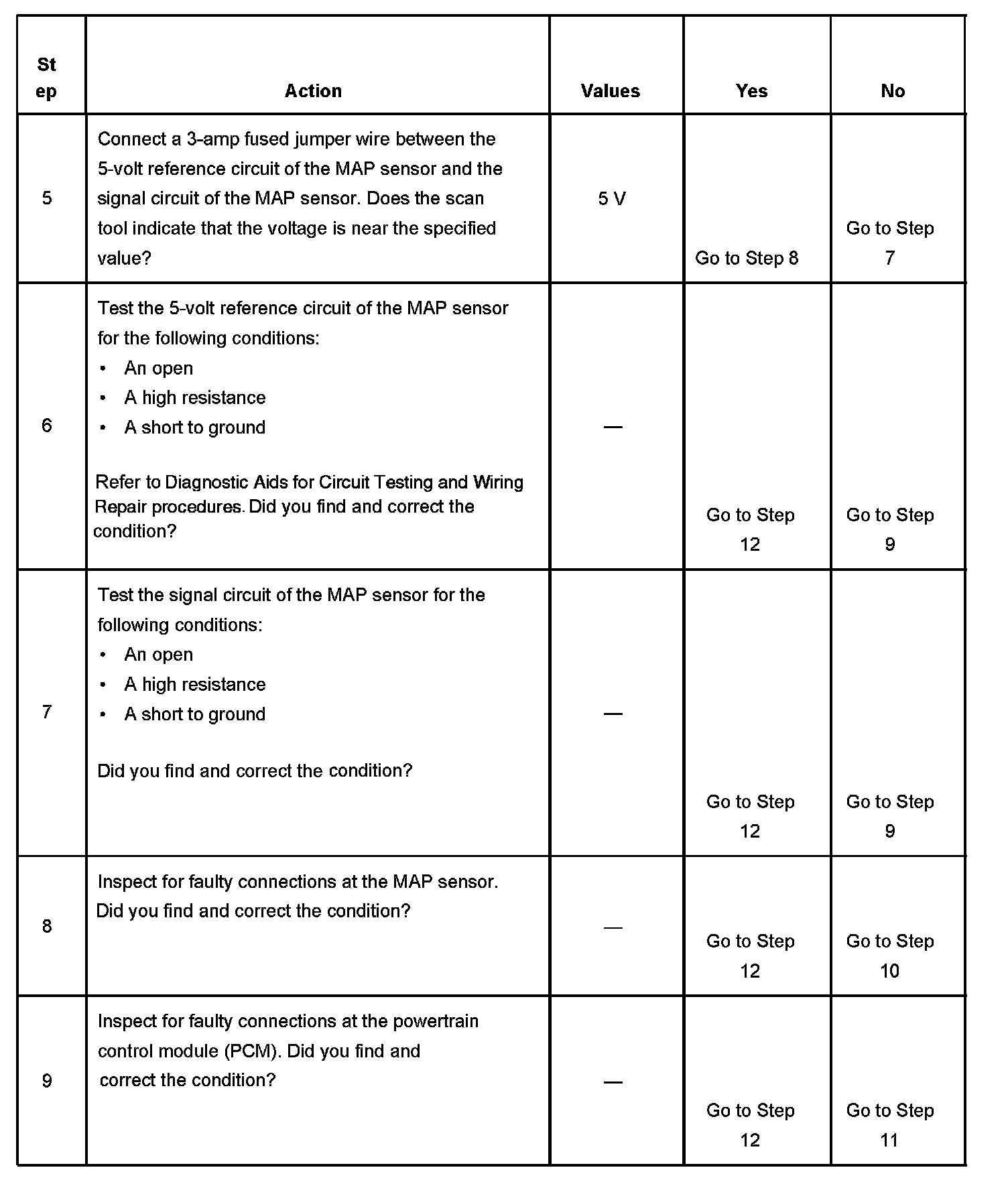 The powertrain control module (PCM) supplies 5 volts to the MAP sensor on the 5-volt reference circuit. The PCM also provides a ground on the low reference circuit. The MAP sensor provides a signal to the PCM on the MAP sensor signal circuit which is relative to the pressure changes in the manifold. The PCM should detect a low signal voltage at a low MAP, such as during an idle or a deceleration. The PCM should detect a high signal voltage at a high MAP, such as the ignition is ON, with the engine OFF, or at a wide open throttle (WOT). The MAP sensor is also used in order to determine the barometric pressure (BARO). This occurs when the ignition switch is turned ON, with the engine OFF. The BARO reading may also be updated whenever the engine is operated at WOT. The PCM monitors the MAP sensor signal for voltage outside of the normal range.