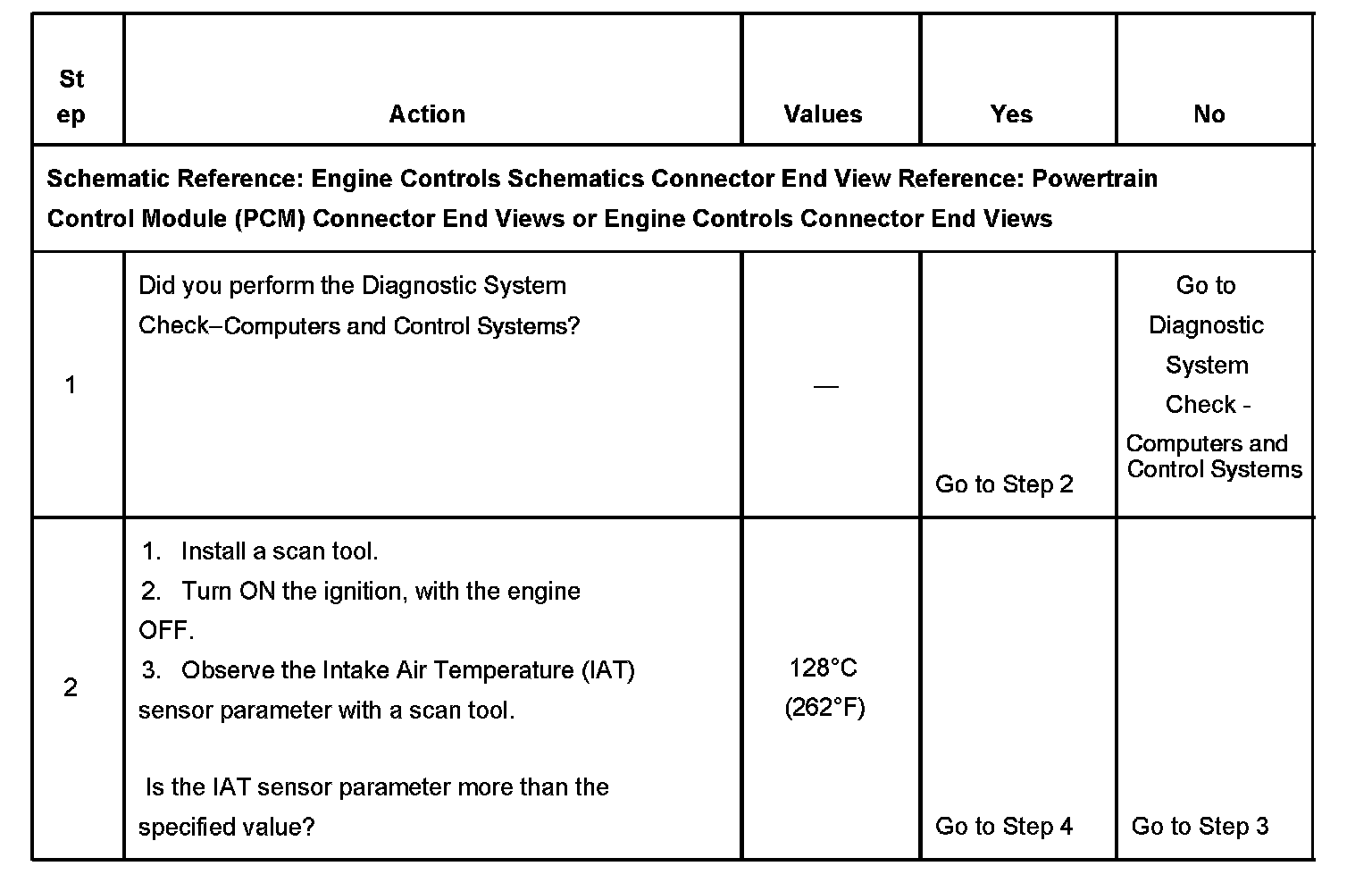 The IAT sensor signal voltage indicates that the intake air temperature is more than 128°C (262°F) for 6.25 seconds.