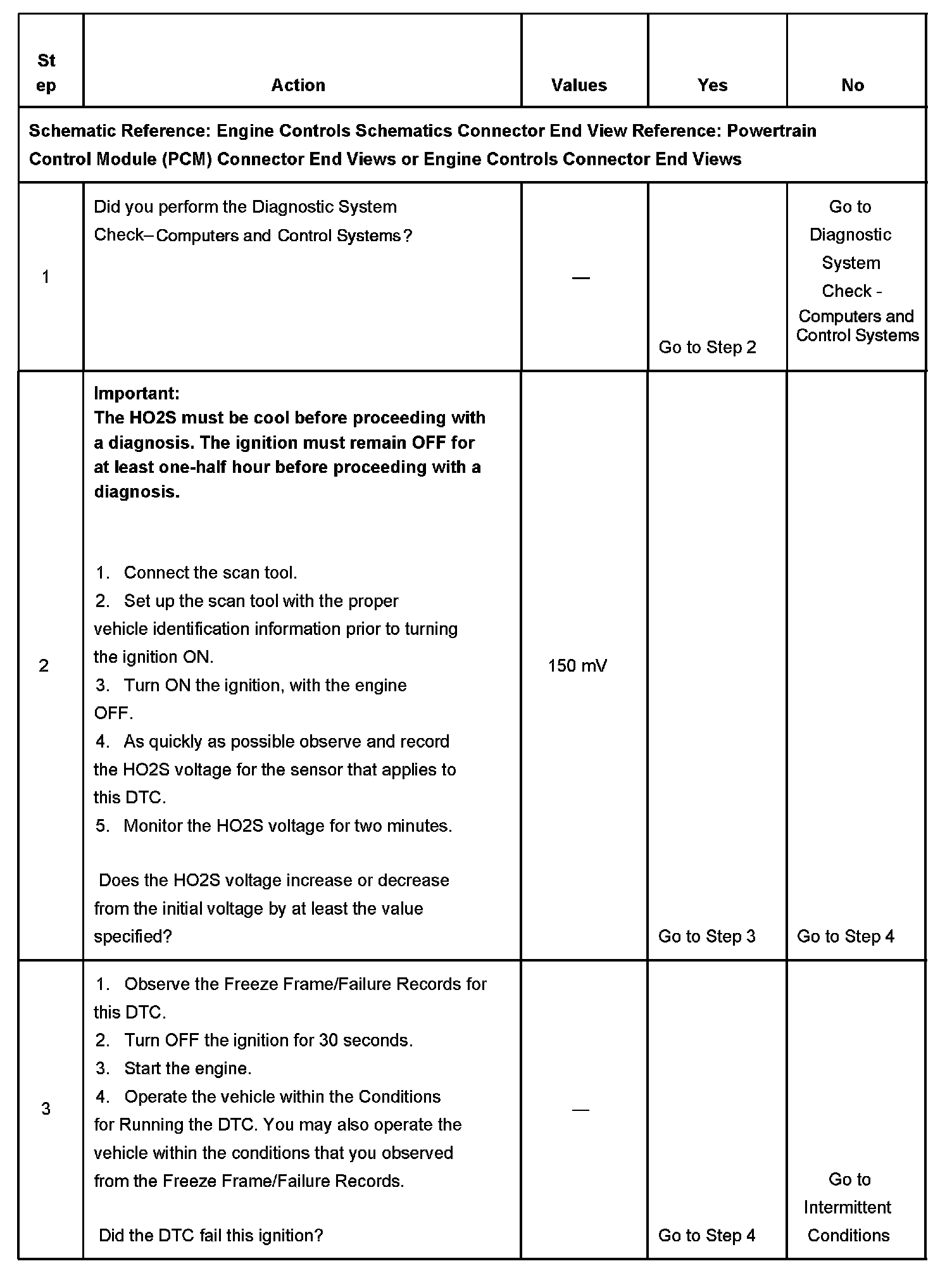 The PCM detects that the HO2S 2 parameter remains within 150 mV of the start-up voltage for a pre-determined amount of time based on ECT and air flow.