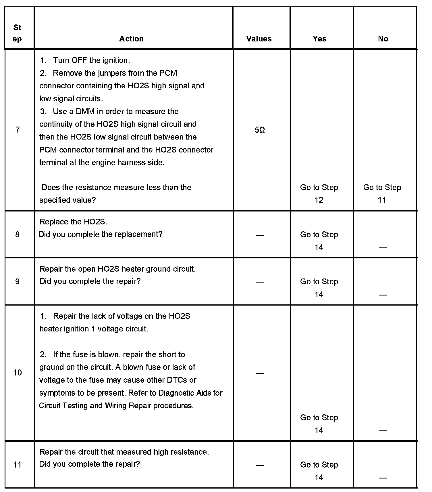 The numbers below refer to the step numbers on the diagnostic table.