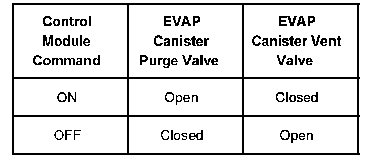 The table illustrates the relationship between the ON and OFF states, and the OPEN or CLOSED states of the EVAP canister purge and vent valves.