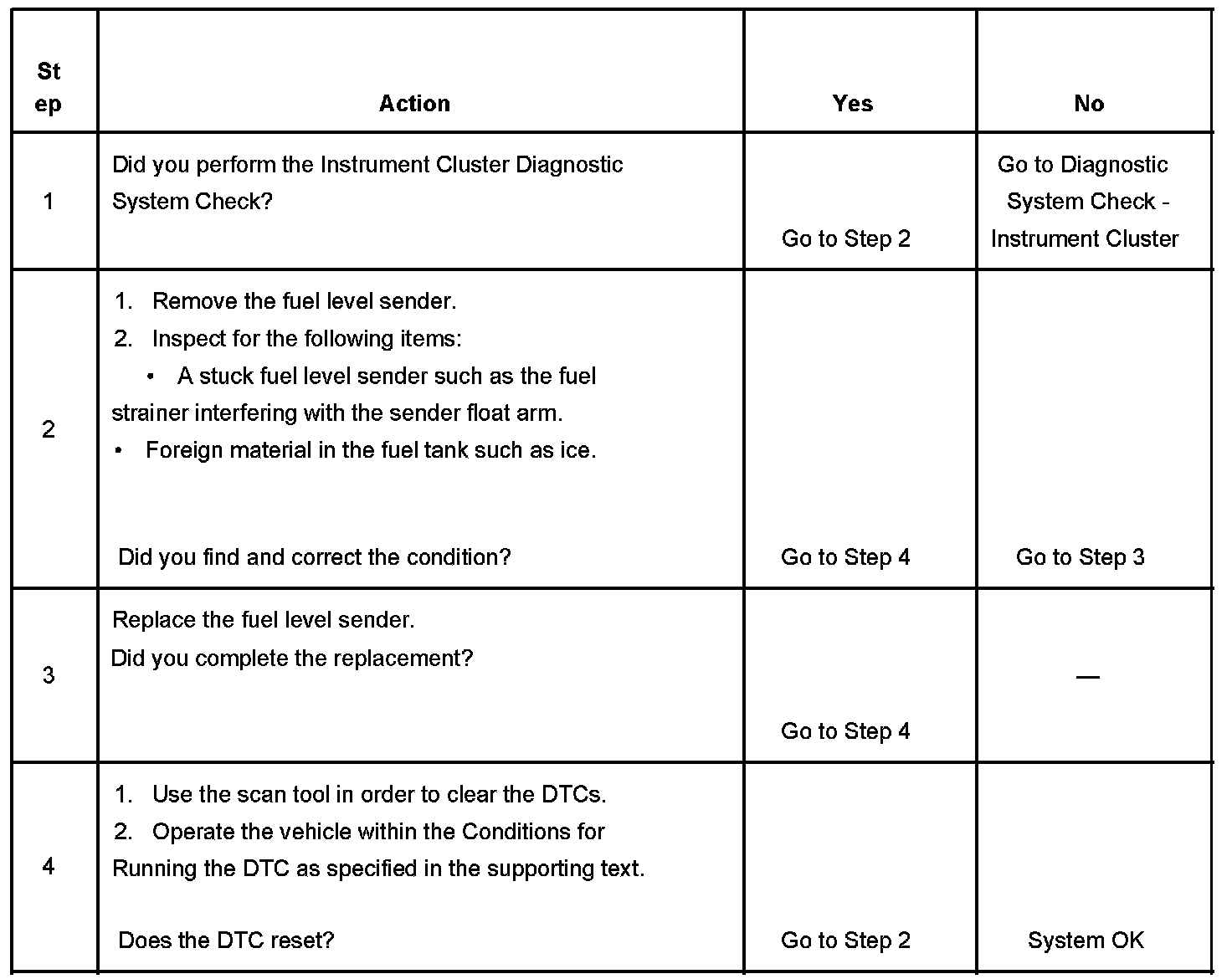 The fuel level sender changes resistance based on fuel level. The PCM monitors the signal circuit of the fuel level sender in order to determine fuel level. When the fuel tank is full, the sender resistance is high and the PCM senses a high signal voltage. When the fuel tank is empty, the sender resistance is low and the PCM senses a low signal voltage. The PCM uses the signal circuit of the fuel level sender in order to calculate the total remaining fuel percentage in the tank. The PCM sends the fuel level percent via the class 2 serial data circuit to the instrument cluster in order to control the fuel gage. The fuel level information is also used for misfire and EVAP diagnostics.