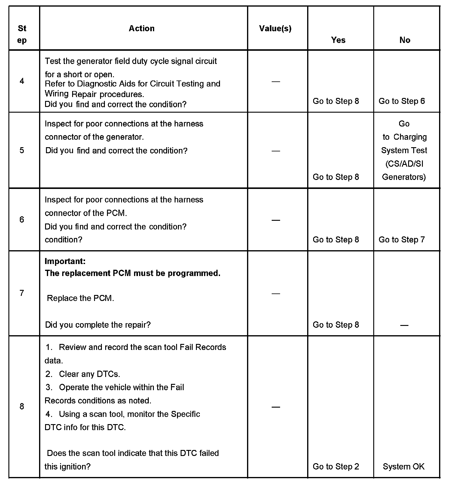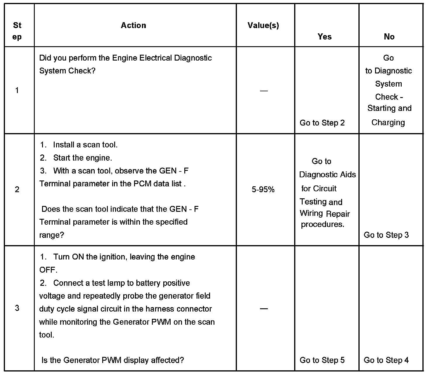 CIRCUIT DESCRIPTIONThe PCM uses the generator field duty cycle signal circuit to monitor the duty cycle of the generator. The generator field duty cycle signal circuit connects to the high side of the field winding in the generator. A pulse width modulated (PWM) high side driver in the voltage regulator turns the field winding ON and OFF. The PCM uses the PWM signal input to determine the generator load on the engine. This allows the PCM to adjust the idle speed to compensate for high electrical loads.