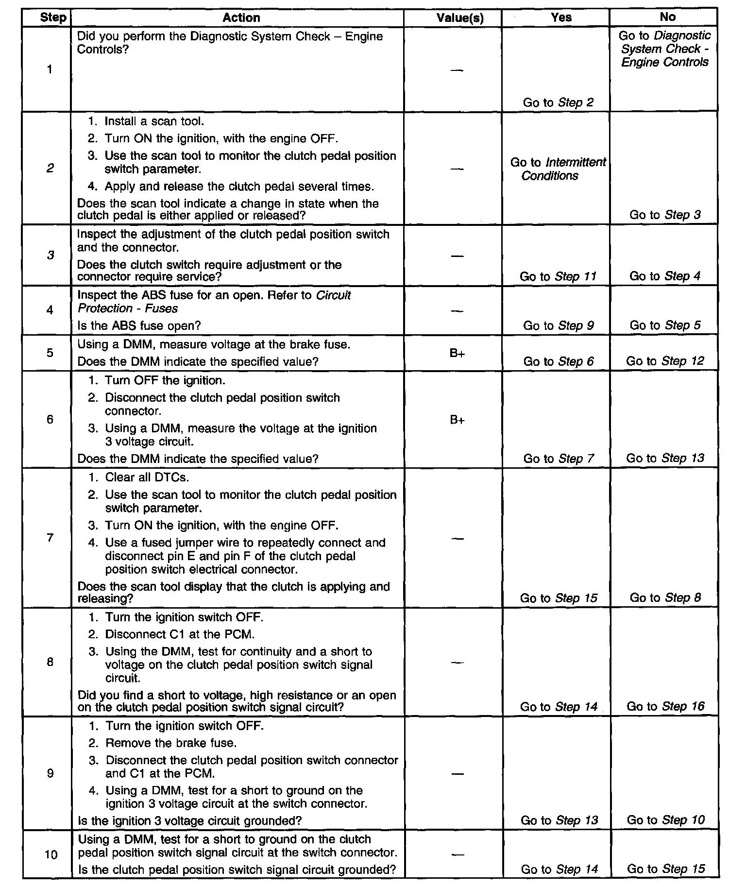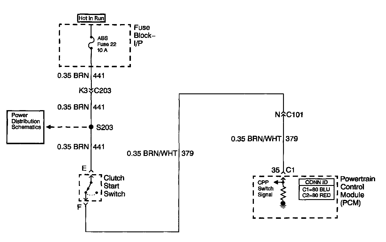 Battery voltage is supplied from the ABS fuse to the clutch switch. The clutch switch is a normally closed switch. When the clutch pedal is released, the clutch pedal position switch signal circuit is pulled up to B+. When the clutch pedal is applied, the switch opens, and the voltage drops to 0 volts.