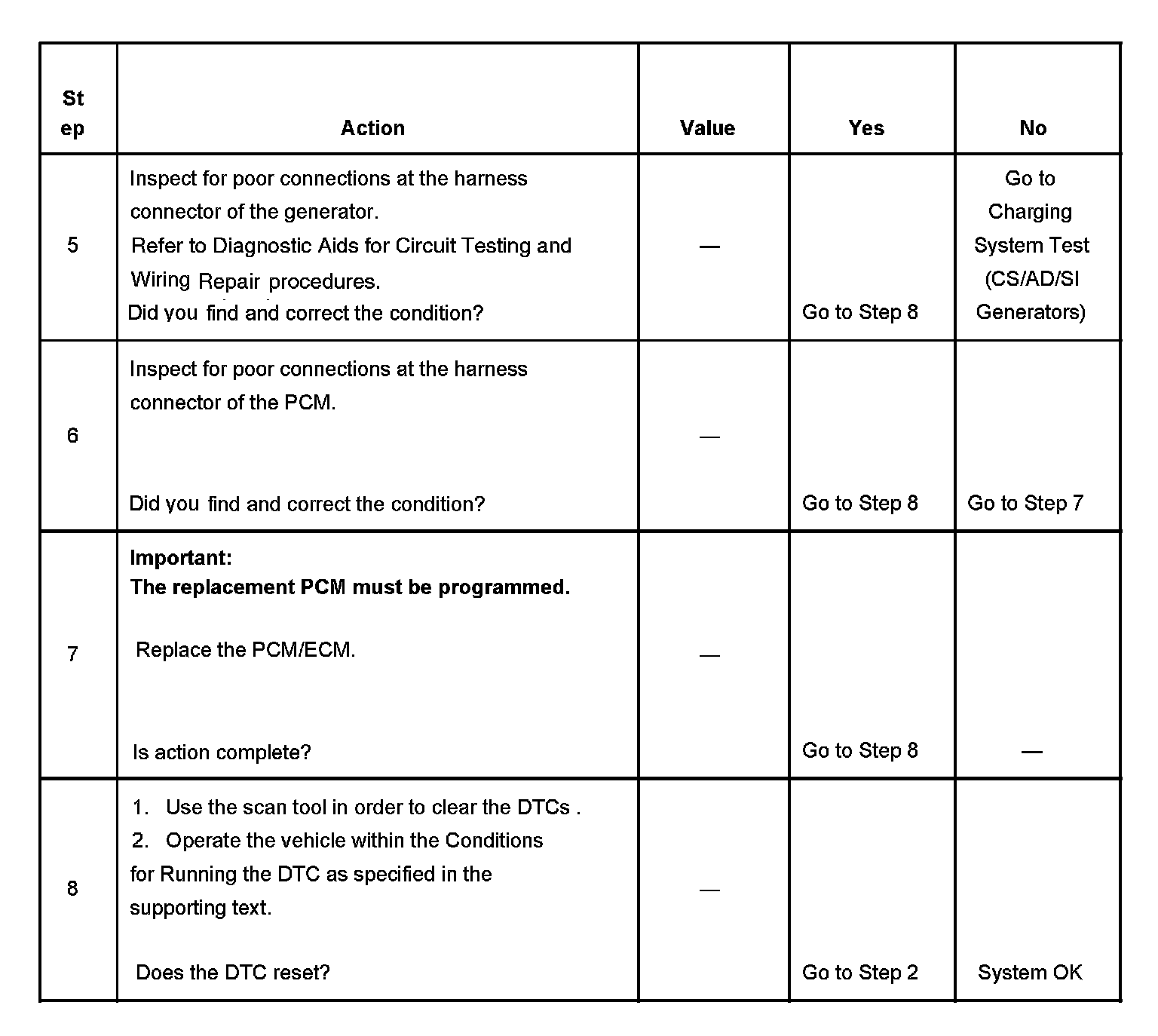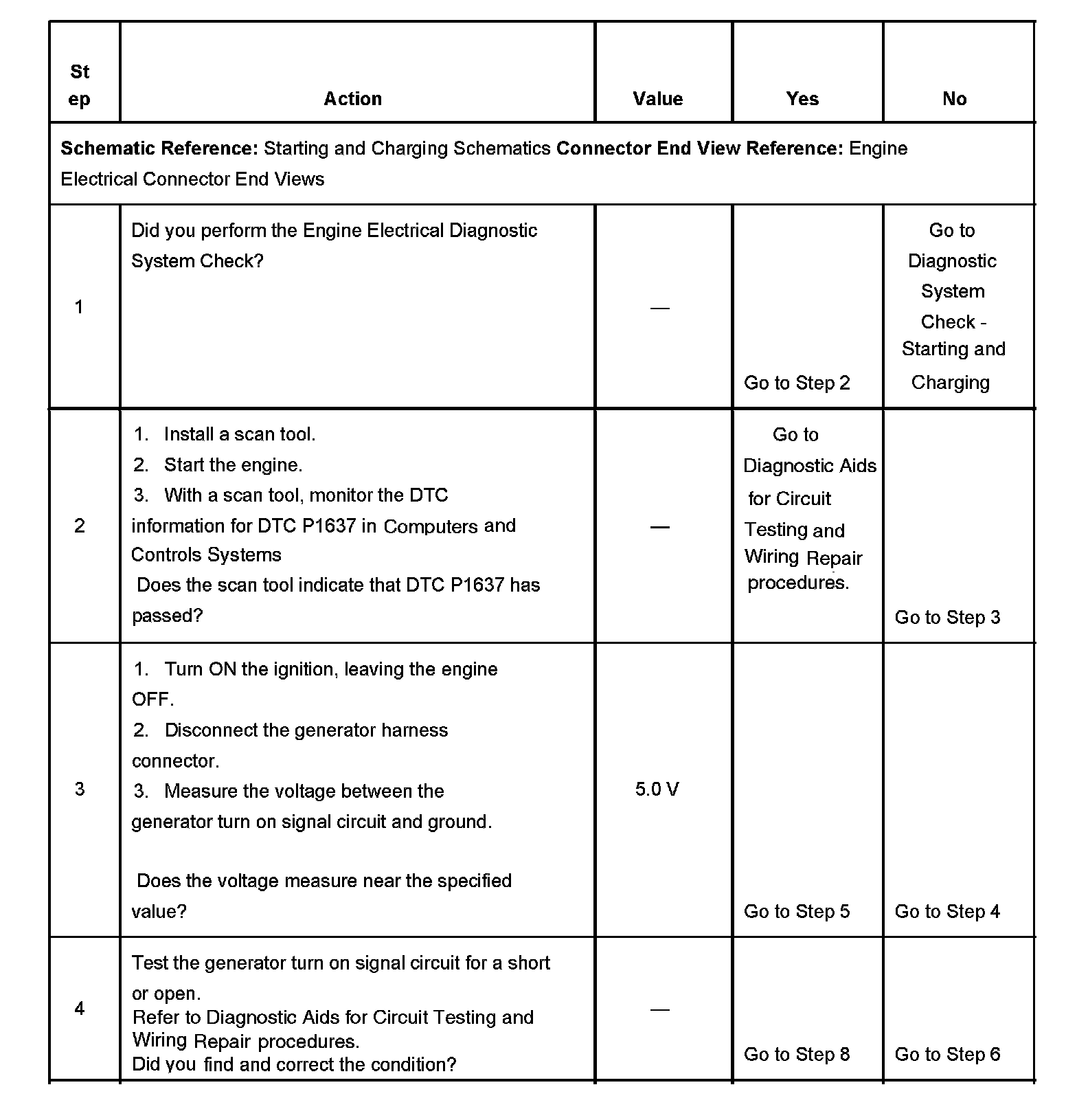 CIRCUIT DESCRIPTIONThe powertrain control module (PCM) uses the generator turn on signal circuit to control the generator. A high side driver within the PCM allows the PCM to turn the generator ON and OFF. When Generator operation is desired, the PCM sends a 5 volt signal to the voltage regulator via the generator turn on signal circuit. This causes the voltage regulator to begin controlling the generator field circuit. Once the Generator is enabled by the PCM, the voltage regulator controls generator output independently of the PCM. Under certain operating conditions, the PCM can turn OFF the generator by turning OFF the 5 volt signal on the generator turn on signal circuit. The PCM has fault detection circuitry which monitors the state of the generator turn on signal circuit. If the fault detection circuit senses a voltage other than what is expected, this DTC will set. The voltage regulator also contains fault detection circuitry. If the regulator detects a problem, the regulator will ground the generator turn on signal circuit, pulling the voltage low. This also causes the PCM to set the DTC.