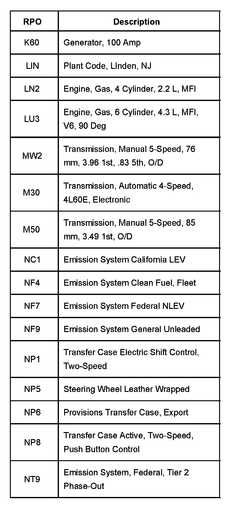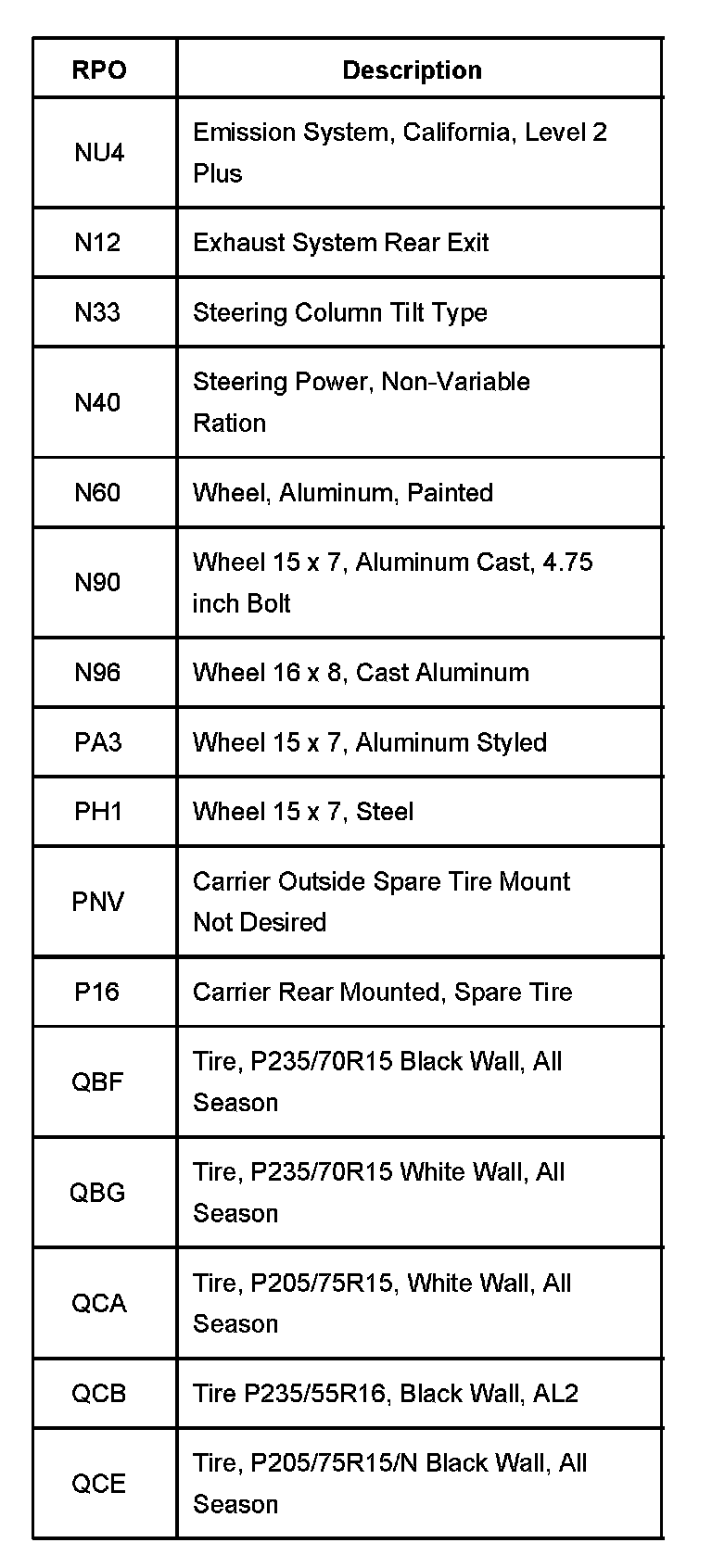 RPO Code List Part 1: