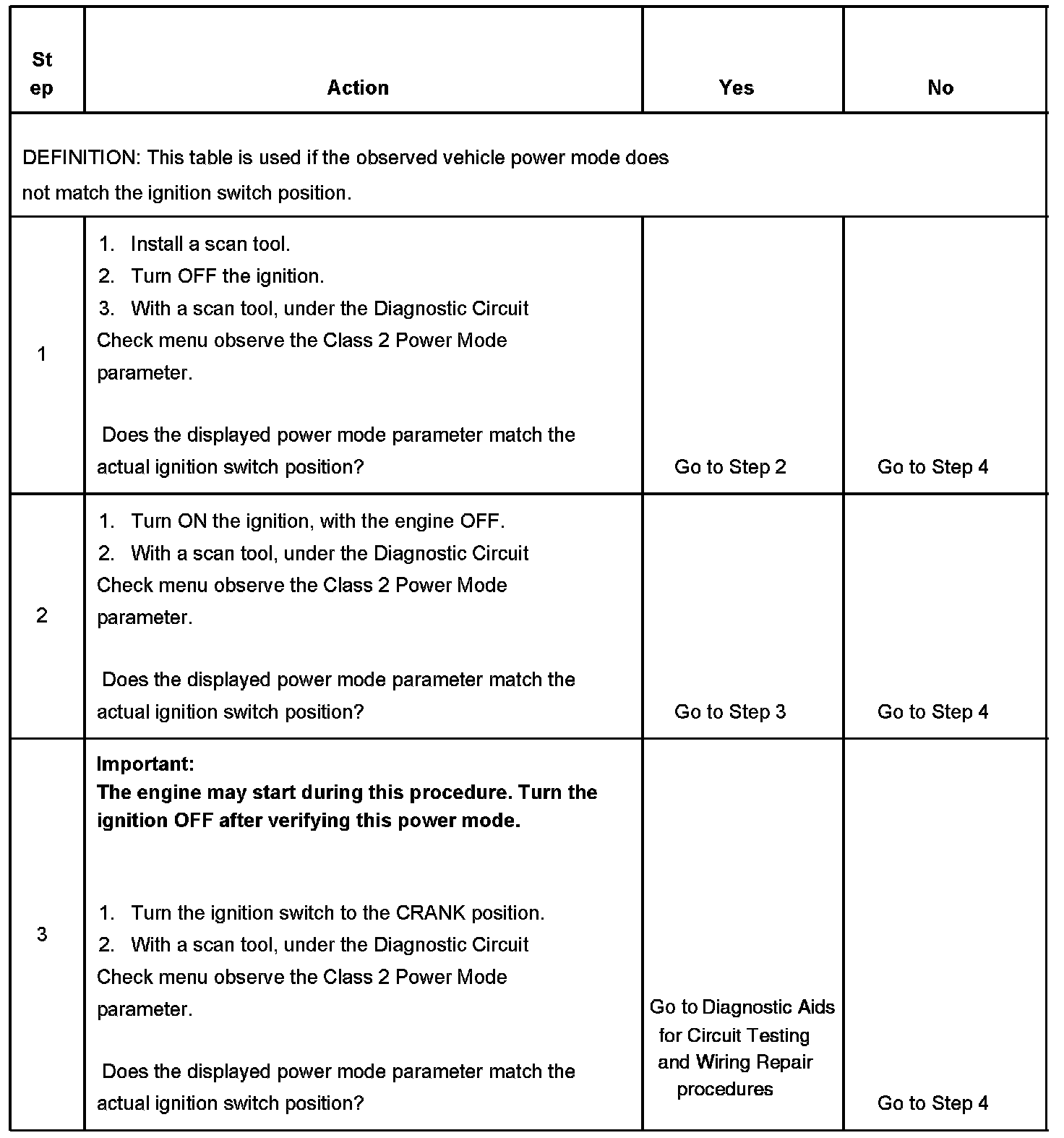 Normal vehicle class 2 communications and module operations will not begin until the system power mode has been identified. Discrete wires from the ignition switch contacts are monitored by the power mode master (PMM) module in order to determine the correct power mode. The PMM communicates the system power mode to all class 2 modules on the class 2 serial data line. Refer to Body Control System Description and Operation to identify which module is the PMM and the applicable power mode look up table.