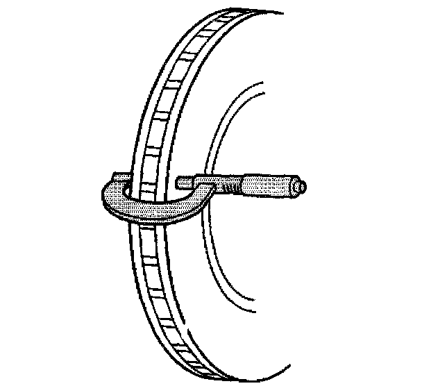 2. Using a micrometer calibrated in ten-thousands of an inch, measure and record the lowest thickness of the brake rotor at four or more points, equally spaced around the rotor. Ensure that the measurements are only taken within the brake pad lining contact area and that the micrometer is positioned the same distance from the outside edge of the rotor for each measurement.