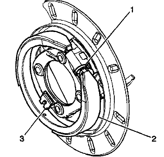 1. Install a new park brake shoe (2) over the axle flange.